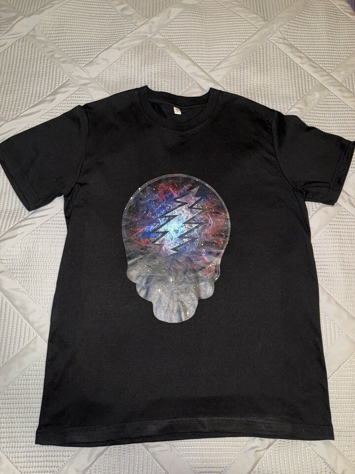 Channel the cosmic vibes of the Grateful Dead with this eye-catching galaxy skull tee. Featuring the iconic lightning bolt skull design filled with a vivid nebula backdrop, this shirt blends classic rock culture with modern psychedelic art.