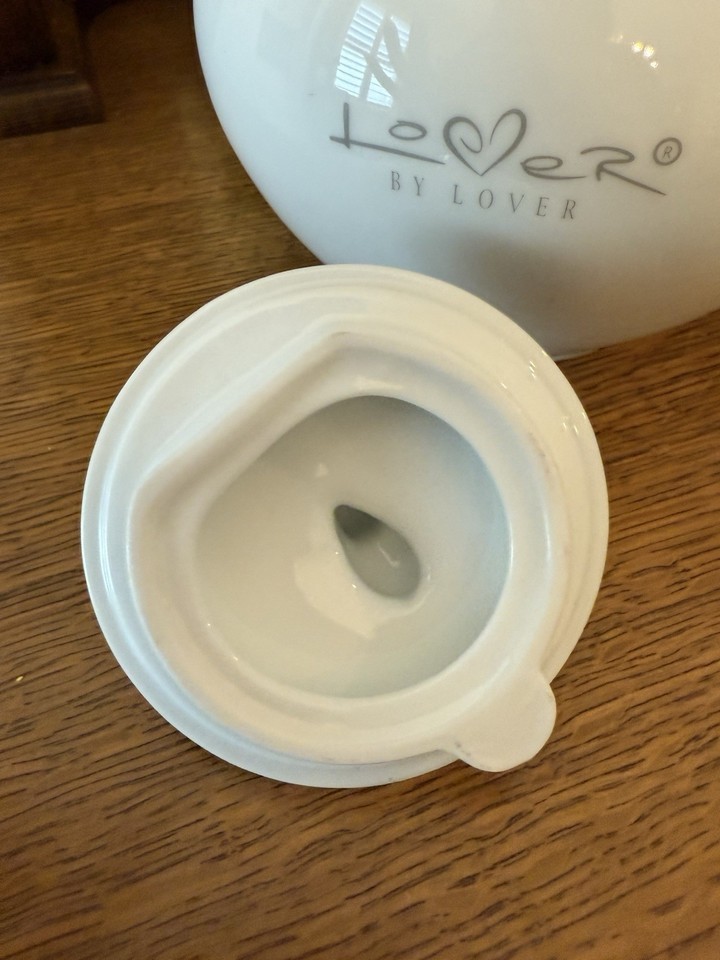Charming modern porcelain teapot from the BergHOFF Lover by Lover collection. Crafted of vitreous porcelain in crisp white with a glossy black handle and whimsical double-heart finial on the lid. Microwave and dishwasher safe. A fun and functional statement piece for tea lovers or design collectors.