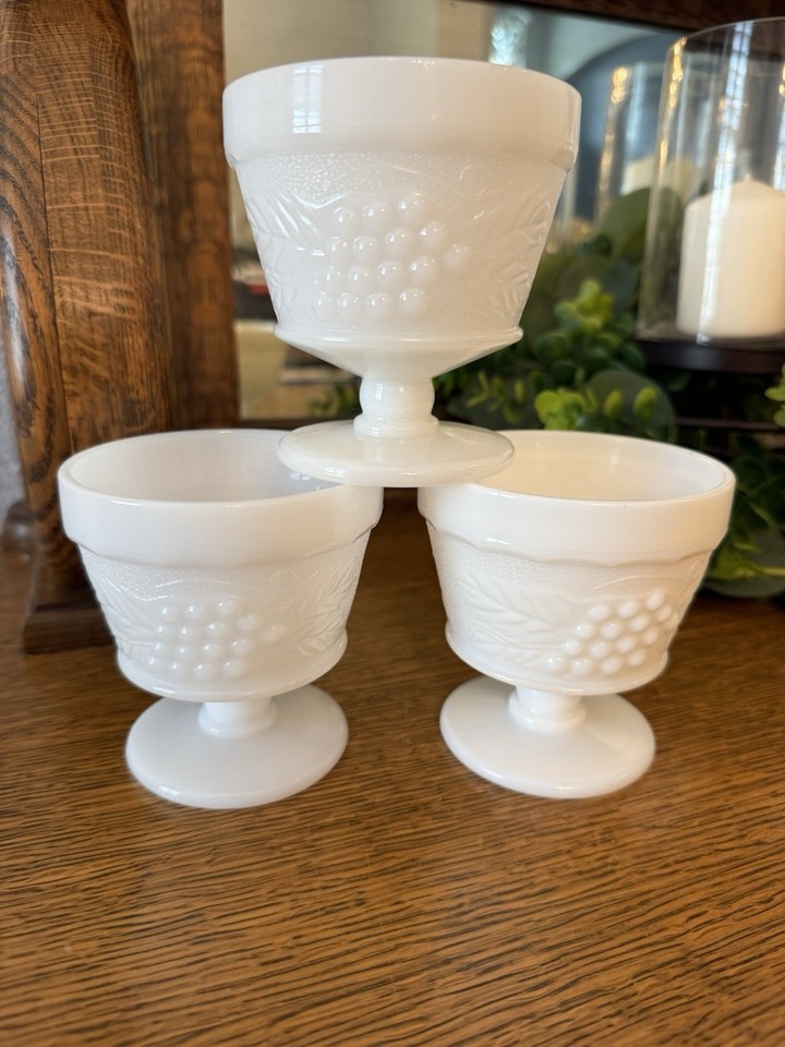 Set of 3 vintage Westmoreland milk glass sherbets in the classic Paneled Grape pattern. These footed dessert cups feature raised grape clusters and leaf detail with a glossy milk glass finish.