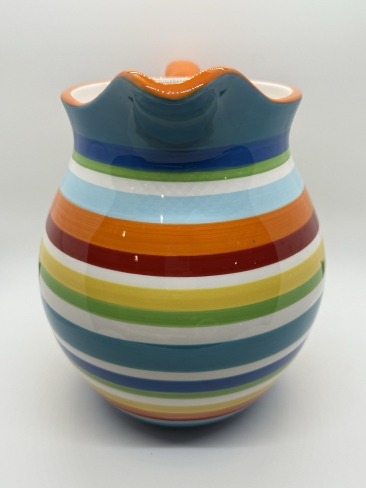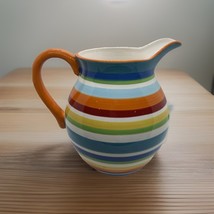 Crate & Barrel Pitcher Rainbow Stripe Ceramic Jug 8.5" Festive Farmhouse 96oz