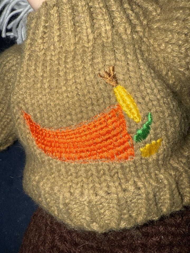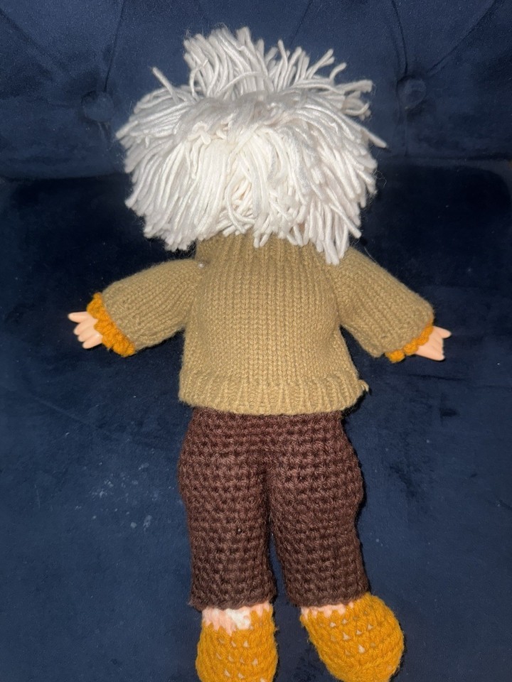 The doll is dressed in cozy crocheted clothing, including a knit sweater with embroidered chili pepper detail, brown crochet pants, and mustard-gold booties. A true one-of-a-kind piece, likely crafted from a kit or by a skilled home crafter in the late 1970s or early 1980s.