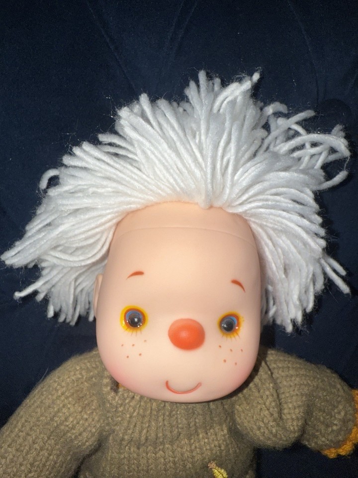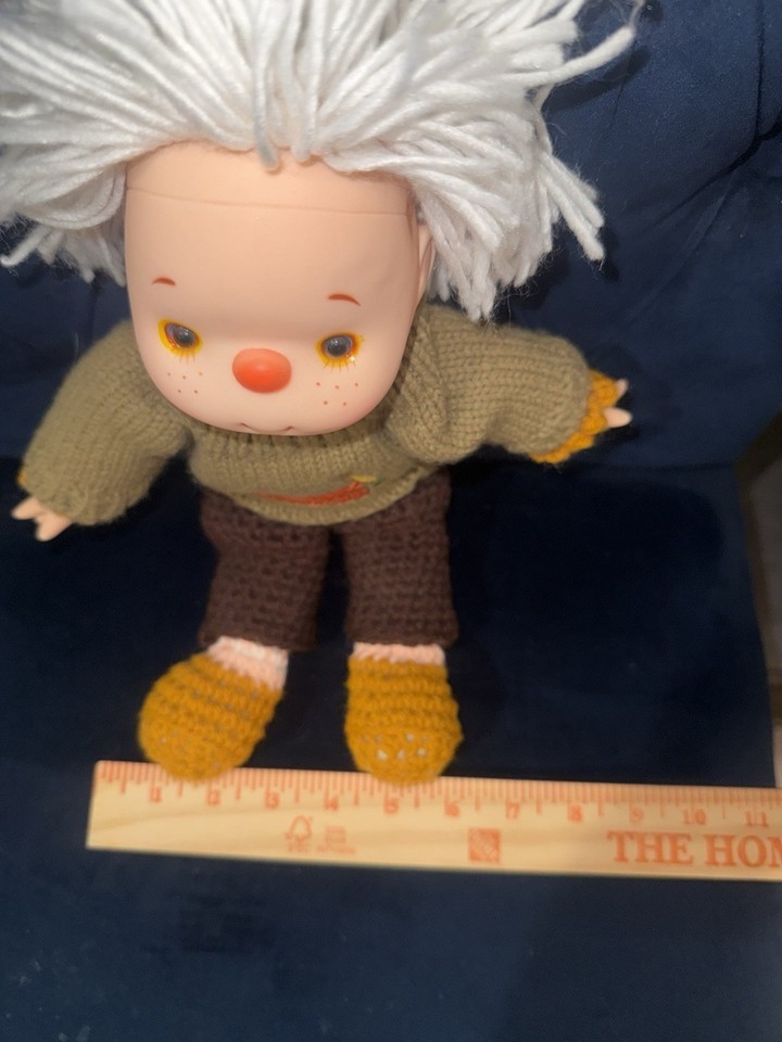 Step back into the 1970s with this charming vintage handmade doll. Measuring approx. 16 inches tall, this unique creation features a soft fabric body, plastic head with painted face, and whimsical yarn hair.