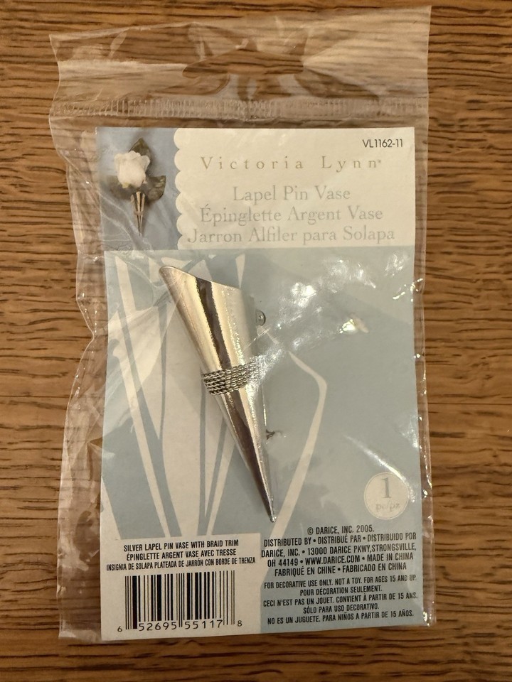 The Victoria Lynn Brand Sealed Lapel Vase Pin is a stylish accessory perfect for a wedding or any special occasion. This silver-colored pin features a cone shape with braid trim, adding a touch of elegance to any outfit. Made of metal, this new pin from Darice Victoria Lynn is a versatile piece that can be worn as a statement accessory to enhance any ensemble.
