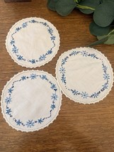 Vintage Hand Embroidered Linen Doilies-Set of 3 Blue Floral Lace, Estate Find