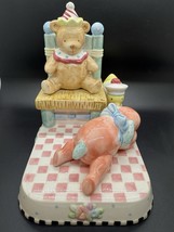 The Vintage 2000 Mary Engelbreit ?Baby Room? Knick Knack ceramic and porcelain collectible with a lovely multicolor glossy finish. Designed by Mary Engelbreit, featuring whimsical bear, duck, and bunny friends making it perfect for nurseries, baby shower gifts, expecting parents, or any collector. Manufactured in 2000, this original piece is in excellent condition without any chips or cracks (see photos) and represents a charming nostalgic addition to any vintage collection.