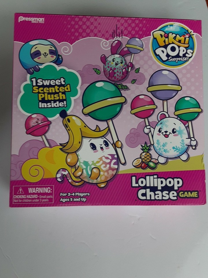 Pressman Pikmi Pops Surprise Lollipop Chase Game. For ages 5 and up with 1 sweet scented plush included. Race around pikmi land, completing challenges to earn Lollipops.