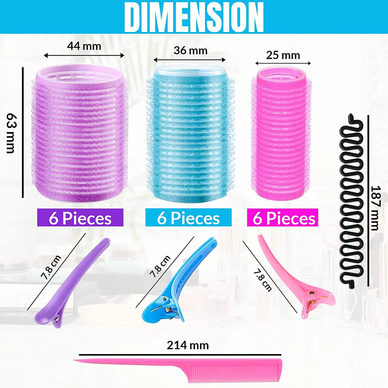 1.A Complete Set,of Velcro hair rollers for hair volume everything you need for stylish curls at home. The set includes 18 self grip hair rollers, 12 duckbill clips,1 braiding device 2 Hair comb.