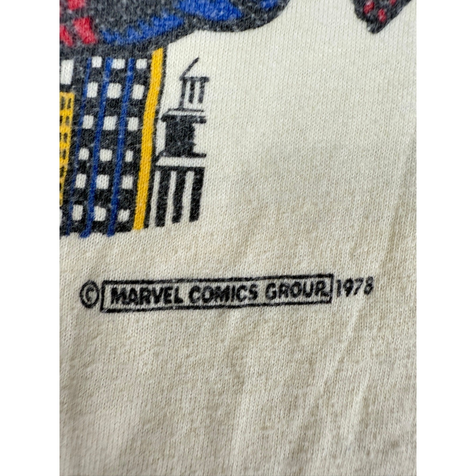 Cotton/polyester blend typical of 1970s ringer tees. Licensed Marvel Comics product.