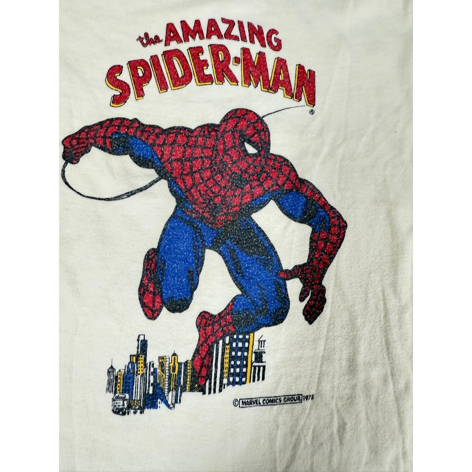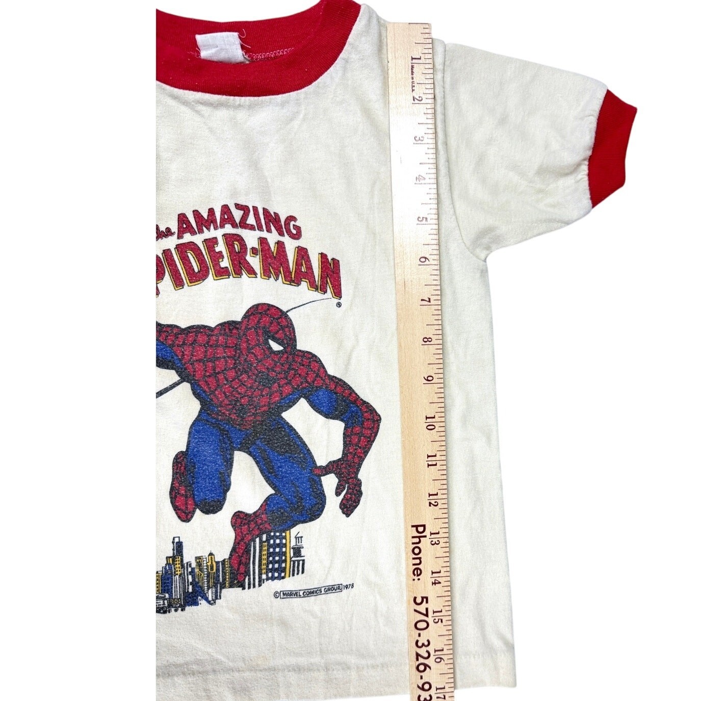 Awesome vintage 1978 Spider-Man ringer T-shirt, Marvel Comics licensed, kids size 6/7. Features a bold Spider-Man graphic on a classic 70s cotton/poly tee with contrasting ringer collar and cuffs.