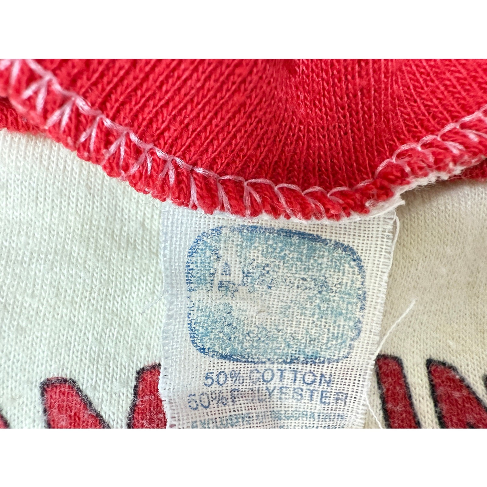 Very good vintage condition. Light age staining (see photos), but graphic remains vibrant and intact. Fabric soft and wearable, with stretch.