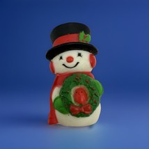 This Vintage Snowman Holiday Pin is a charming collectible. The design features a snowman and bird on a wreath, perfect for adding a festive touch to your holiday decorations or as a unique Christmas brooch.