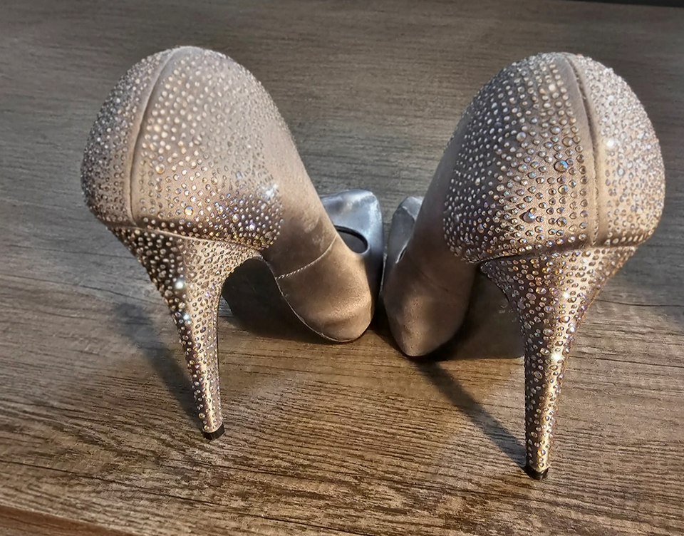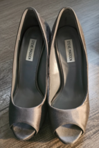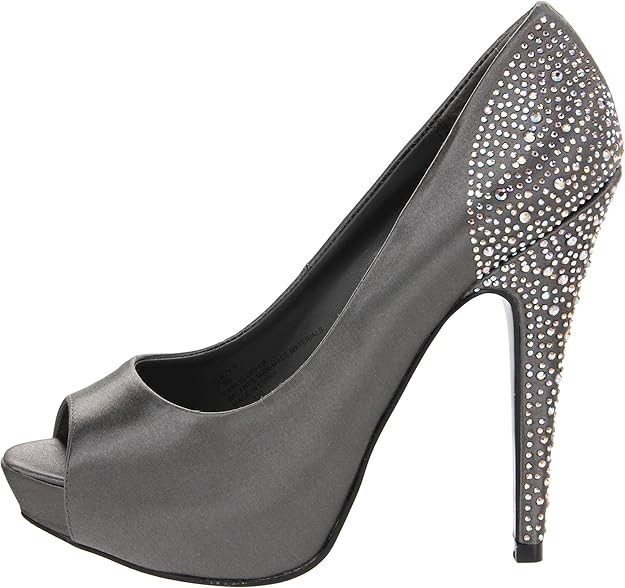 These Steve Madden Grey Peeptoe Playy-R Rhinestone Beaded Stiletto Heels in size 9.5M are an elegant addition to any woman's shoe collection. The ultra-high stiletto heel features eye-catching studded and rhinestone accents that add glamour to any outfit. The slip-on style and peep toe design provide easy wear for special occasions or nights out. Crafted with faux silk upper material and silk outsole, these heels combine comfort with style. Perfect for weddings, parties, or dressy events - pair them with a formal dress or dress down with jeans for versatile styling options. These statement heels are designed to make you stand out. 5.5" heels.