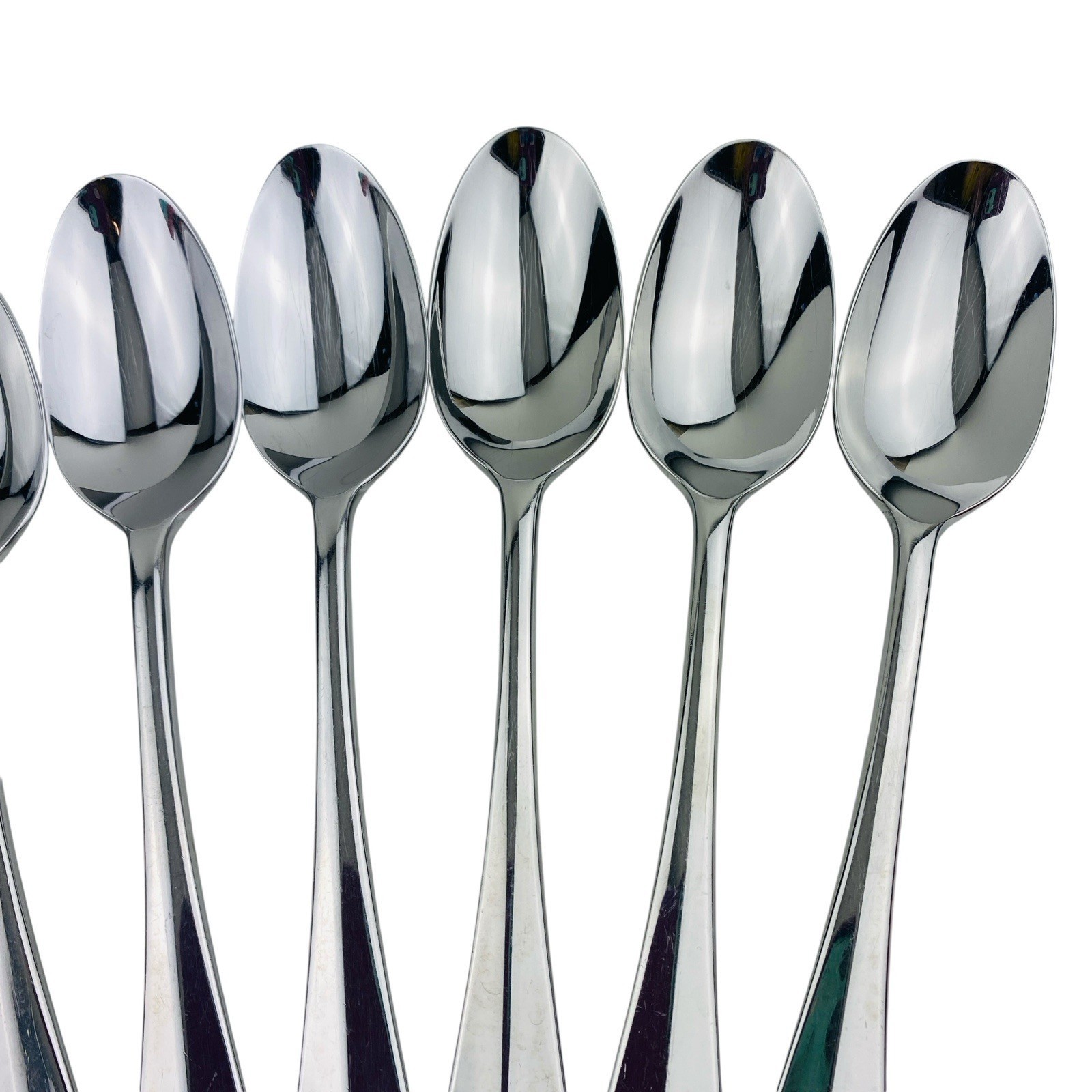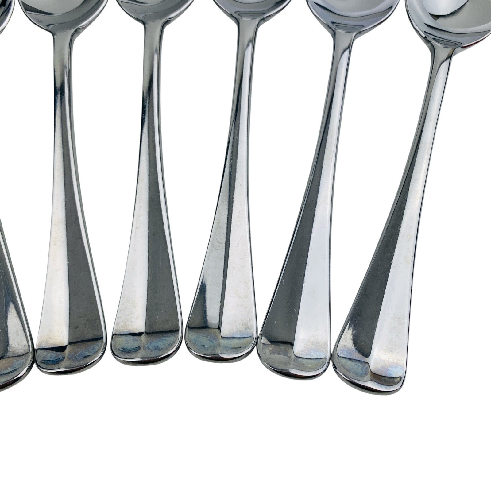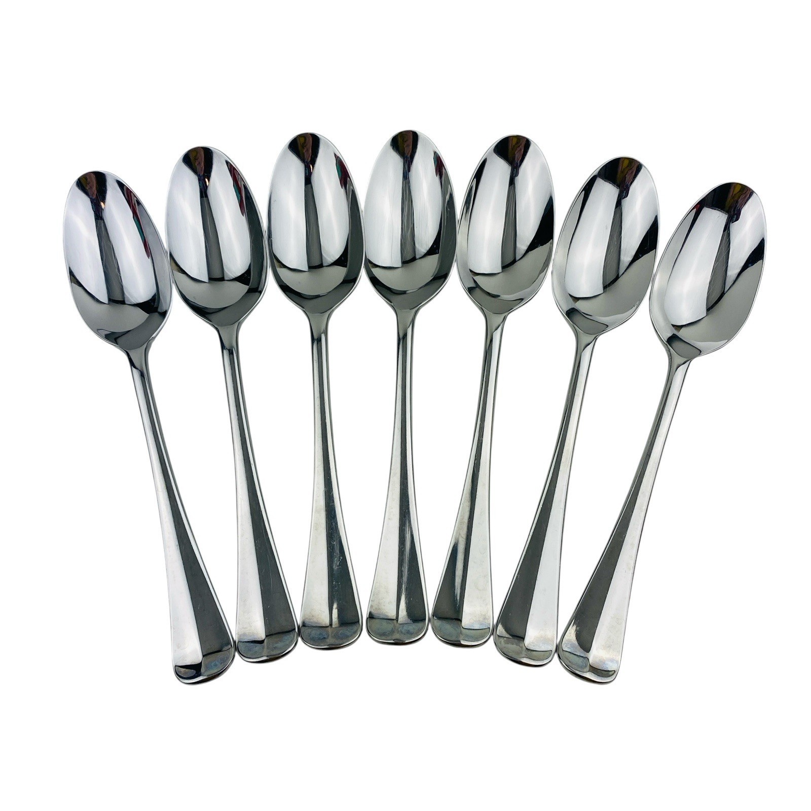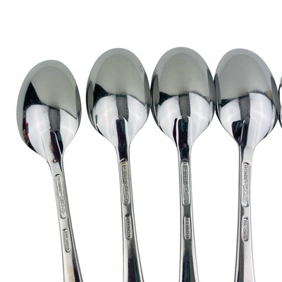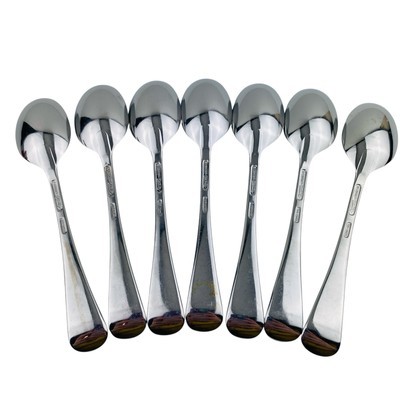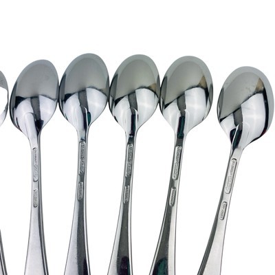 Set of seven Lenox Williamsburg Royal Scroll Place/Oval Soup tablespoons. The spoons measure 6 7/8 inches long. Stainless steel 18/8, glossy finish, made in Korea. The spoons are in very good preowned condition with light signs of use. There is a spot of discoloration on the back handle of one spoon; please see pictures for exact condition details. Ships next day! Check my store for other Lenox Williamsburg Royal Scroll flatware replacement pieces.