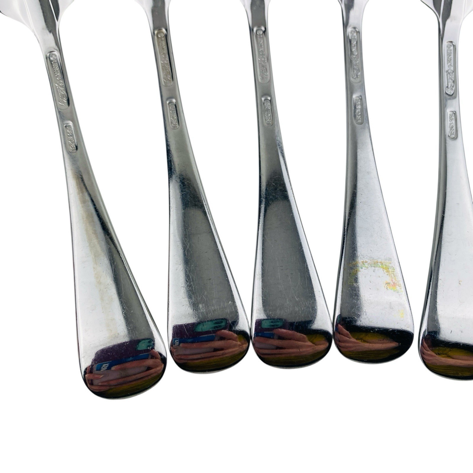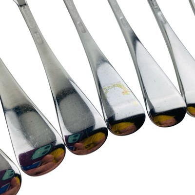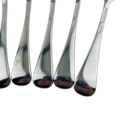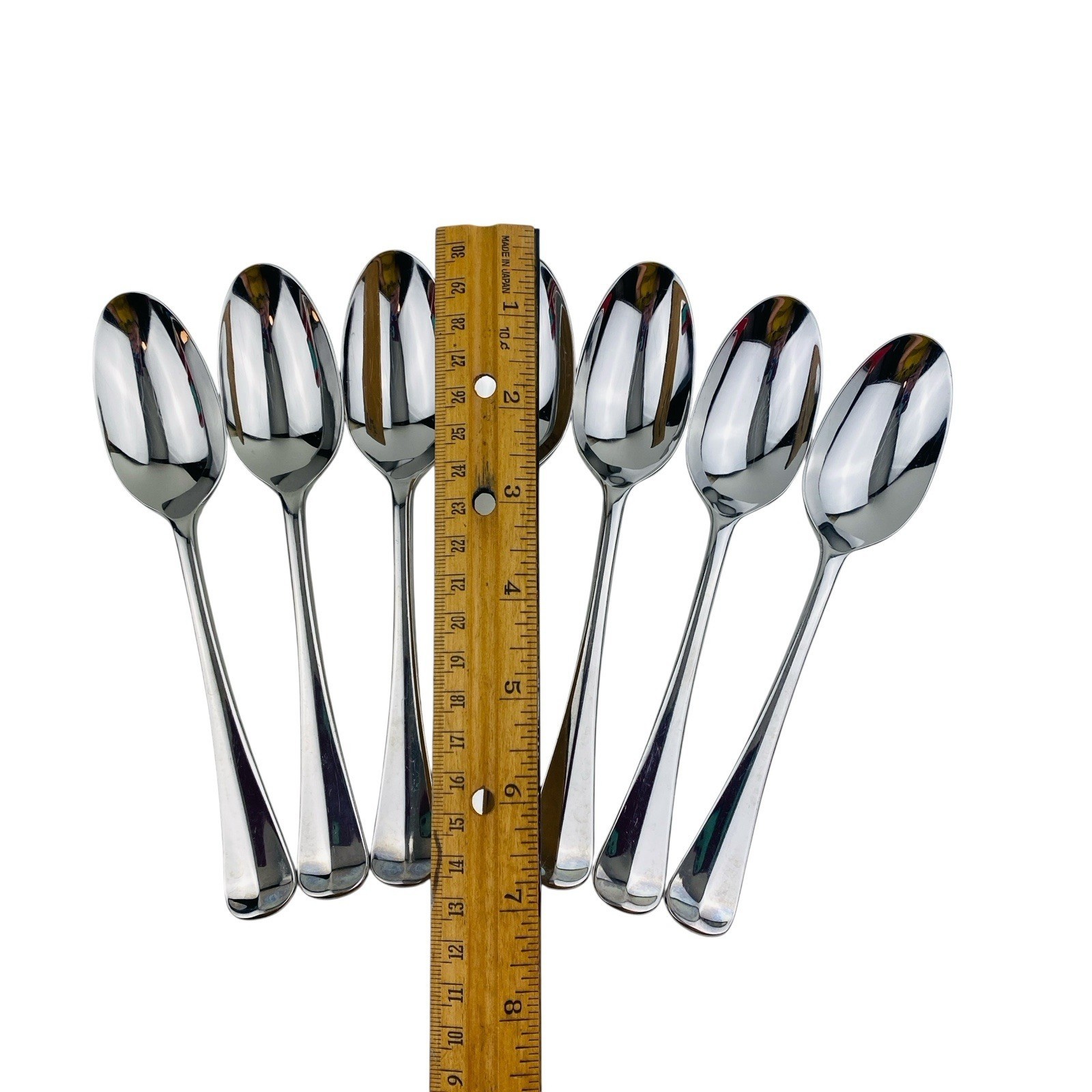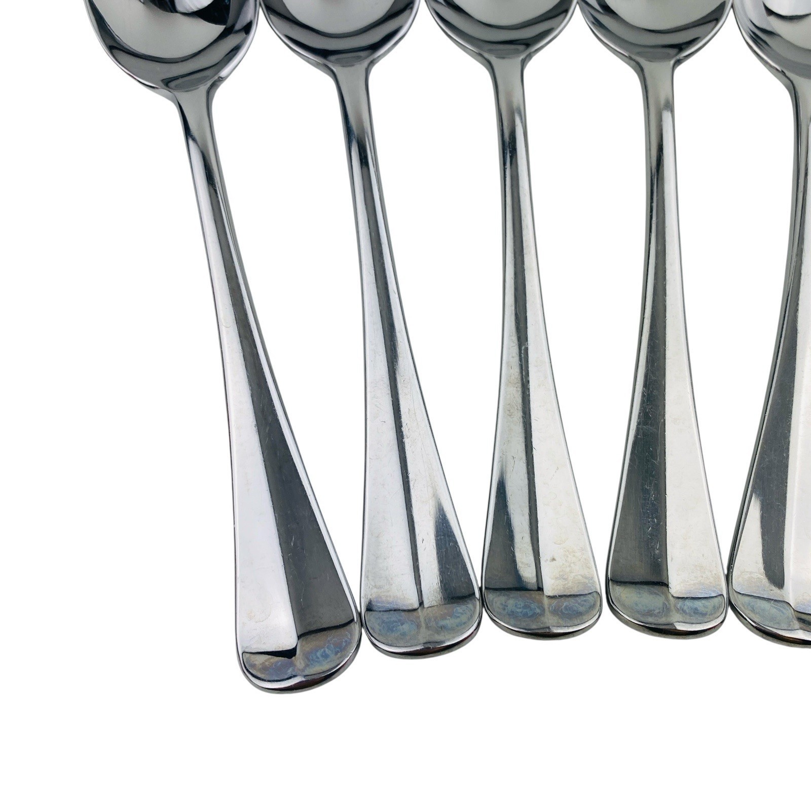 Set of seven Lenox Williamsburg Royal Scroll Place/Oval Soup tablespoons. The spoons measure 6 7/8 inches long. Stainless steel 18/8, glossy finish, made in Korea. The spoons are in very good preowned condition with light signs of use. There is a spot of discoloration on the back handle of one spoon; please see pictures for exact condition details. Ships next day! Check my store for other Lenox Williamsburg Royal Scroll flatware replacement pieces.