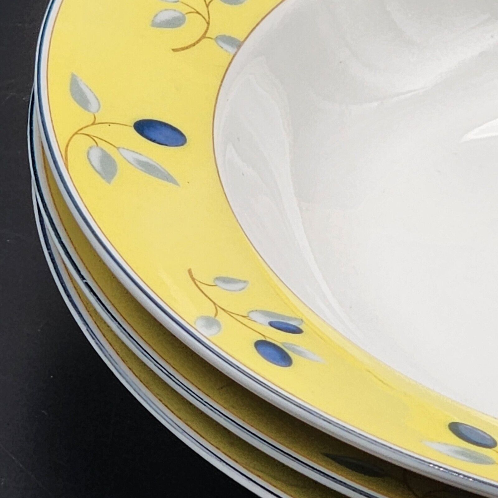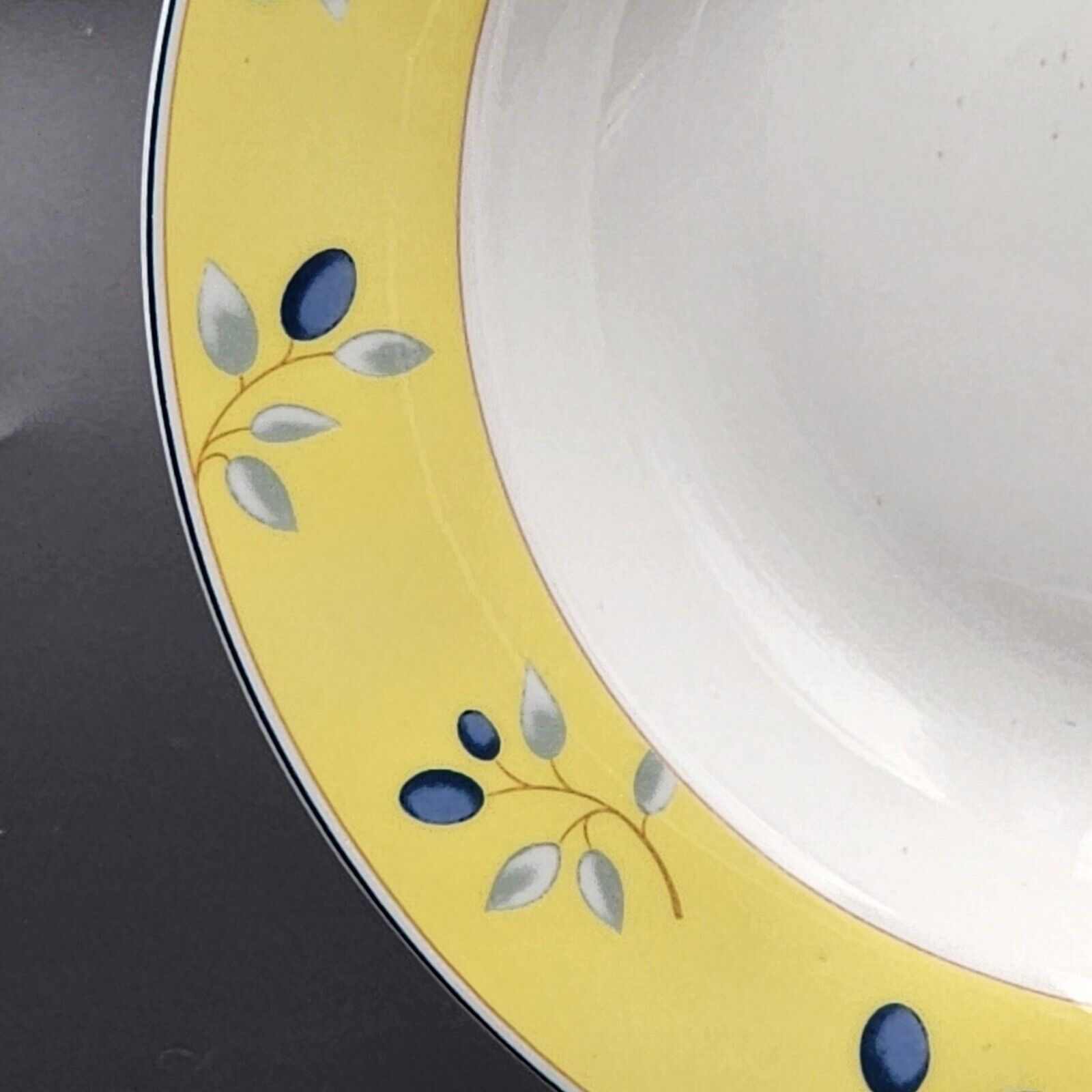 This set of four Royal Doulton Blueberry soup bowls is a must-have for any collector or lover of fine porcelain. The round shape and 8.5 inch diameter of these bowls make them the perfect size for serving soup or any other dish. The glossy finish and yellow color with blueberry pattern add a touch of elegance to any table setting.