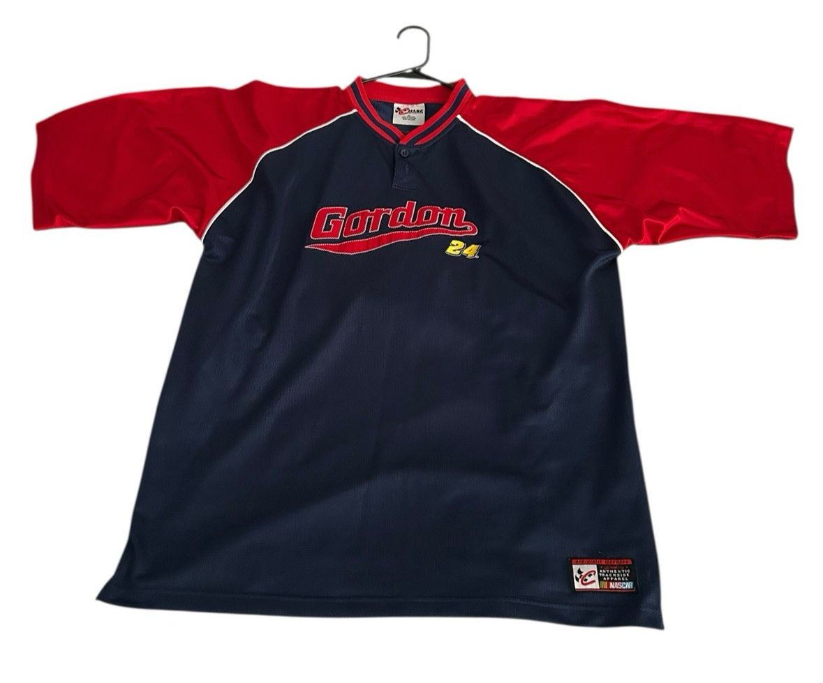 The product is a vintage Y2k Jeff Gordon #24 NASCAR Chase Authentics men's XL jersey shirt in blue and shiny colors. It is an officially licensed shirt featuring Jeff Gordon, driver for the Hendrick Motorsports team in auto racing. The shirt is in the style of a jersey and is a must-have for any Jeff Gordon or NASCAR fan looking to show their support for the iconic driver.