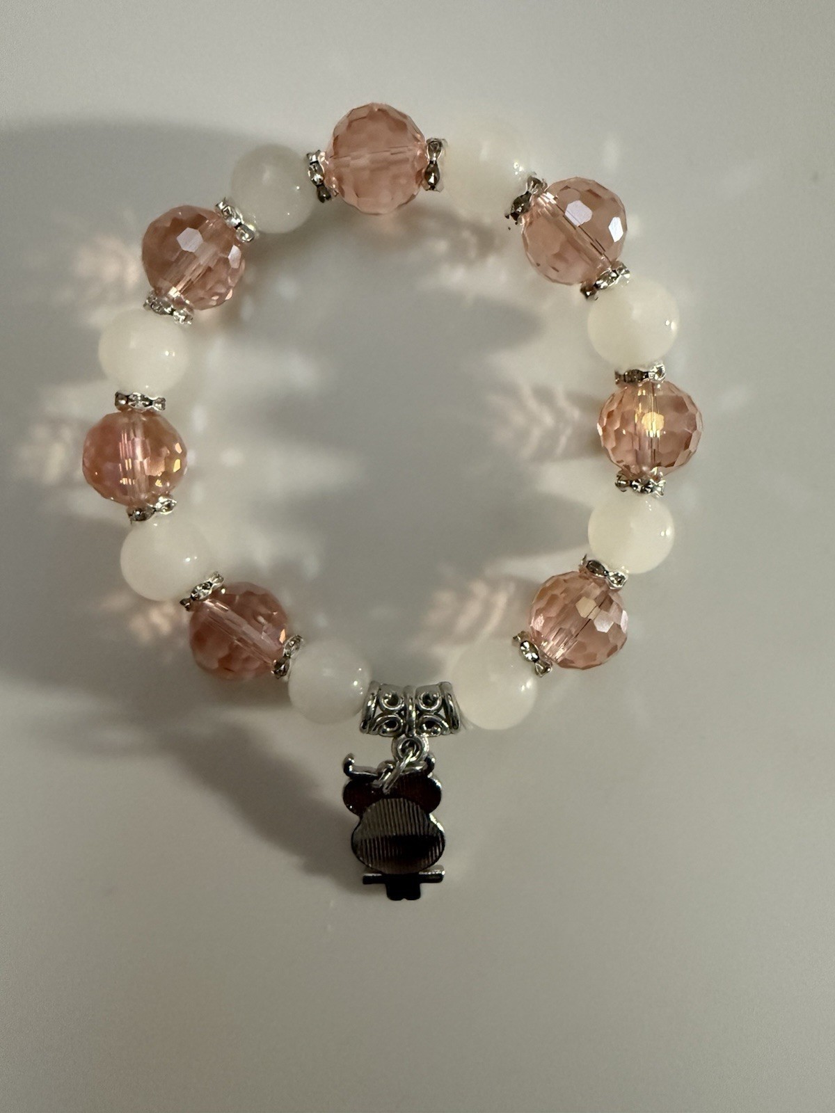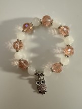PINK Faceted Bead Stretch Bracelet with White Gemstone Beads & Silver Owl Charm