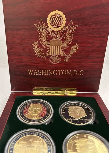SET of FOUR (4) VERY COLLECTIBLE GOLD METAL CHALLENGE COINS IN 5? x 5? WOODEN BOX ?INCLUDES DONALD TRUMP 45th PRESIDENT OF THE UNITED STATES GROUP?EACH IS IN A CLEAR PLASTIC CASE AND EACH COIN MEASURES 1 1/2" ACROSS..3 COINS ARE ENAMEL GOLD ONE IS JUST GOLD METAL ?THEMES ARE 45th PRESIDENT, SAVE AMERICA AGAIN, PHOTO COIN, FREEDOM 2nd AMENDMENT?GREAT FOR ANY COLLECTOR OR A GIFT FOR ANY AGE!!!?