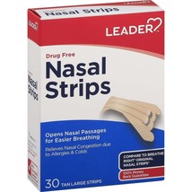 Leader Nasal Strips Drug Free Tan Large Nasal Congestion Relief 30 Count per box. Easier breathing through opening nasal passages. Relieves nasal congestion. Works Instantly.