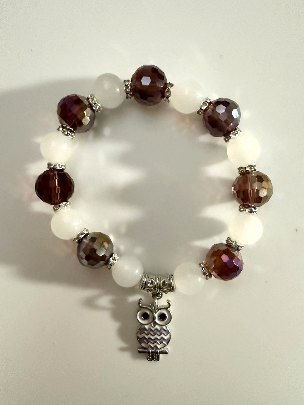 BROWN Faceted Bead Stretch Bracelet with White Gemstone Beads & Silver Owl Charm