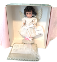 This product is an 2000 Vintage Madame Alexander 8" Doll from the Sunday's Child 27800 series. The doll features dark brown wavy curly hair, blue eyes that open and close, and a light complexion. It comes with various accessories such as necklace, wrist hangtags, wings, a dress, white gloves, doll stand and more. The doll is part of the Days of the Week Series and is designed as a fashion doll. The Doll does not require batteries. It is a retired collector's edition and comes in its original opened box with registration cards.