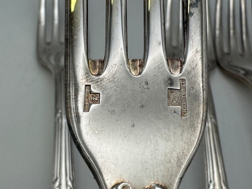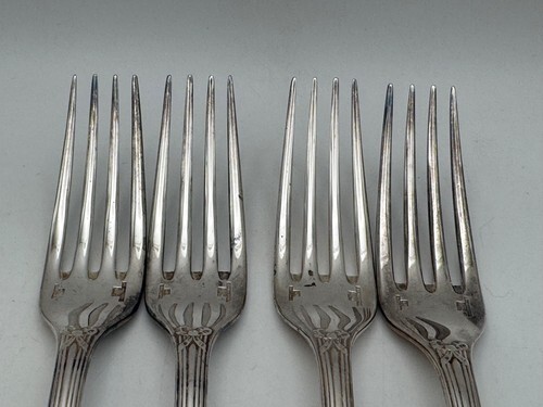 These dinner forks measure 8 1/8" in length and are in very good estate condition with no excessive wear. They have some tarnish and could use a polish.