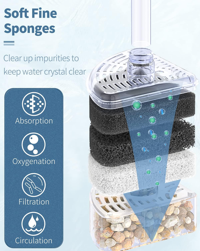 Multi-layer Fine Sponge: Provide mechanical and biological filtration and trap debris or wastes without sucking up your fish. Keep fish tanks crystal clear and healthy.