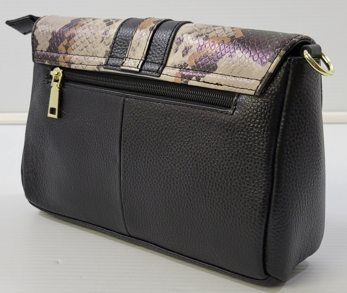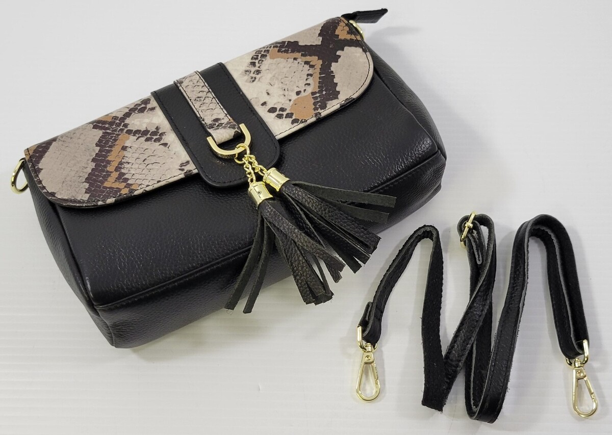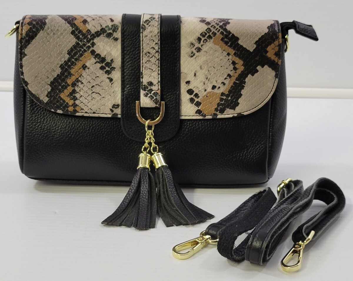 AA) Sencillez Woman Genuine Pebble Leather Snake Skin Print Tassel Bag - Black