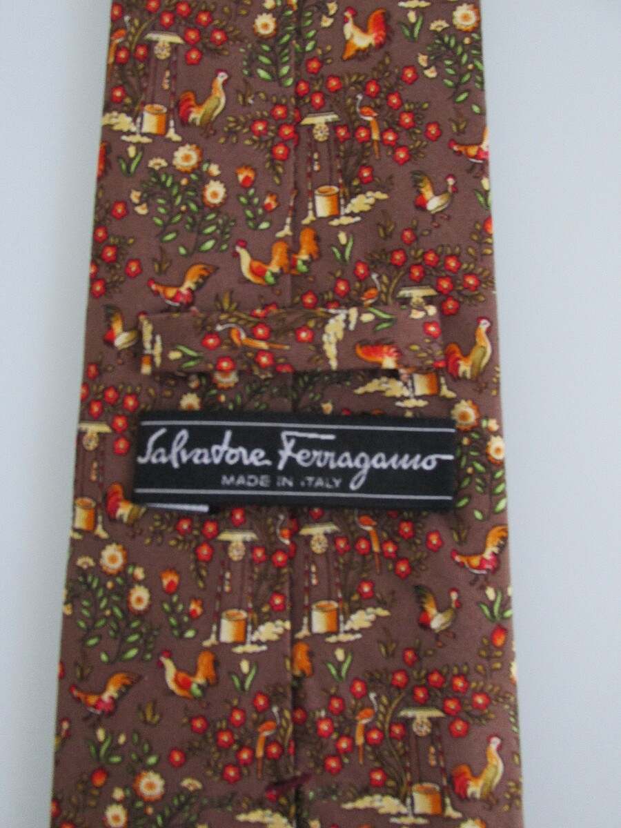 Description: Up for sale is a Salvatore Ferragamo men's designer silk tie. It is handmade in Italy from 100% silk. The dimensions are approximately 56" long x 3 5/8" wide. The tie has a multicolored floral and rooster motif in yellow, green, red, orange, white gold on a light brown colored background. This tie is in excellent condition.