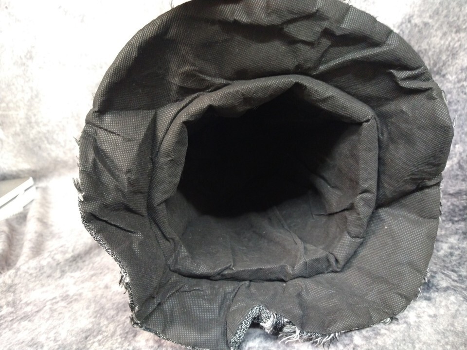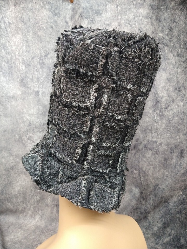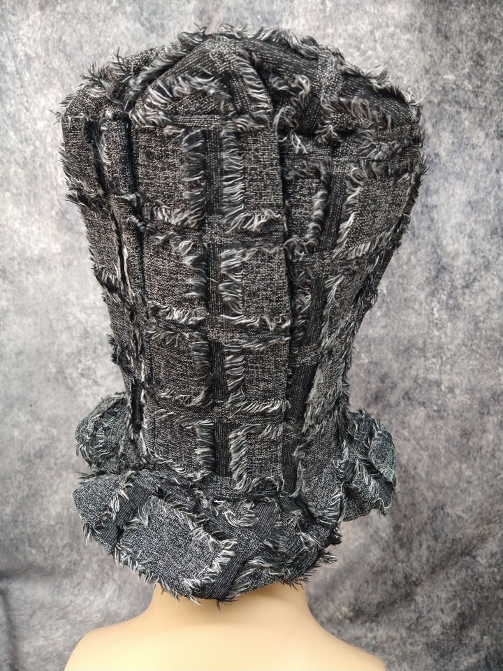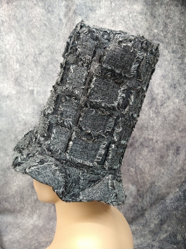 Crumpled Tattered looking Gravedigger Costume Hat. Adult: One size fits most. Unisex: Male or Female. Hat is not adjustable. Has wrinkles and creases. Hat is sorta tall so stuffing with a lightweight material may be needed to maintain shape and desired wear. Brim is not wired and a little wrinkled and out of shape.