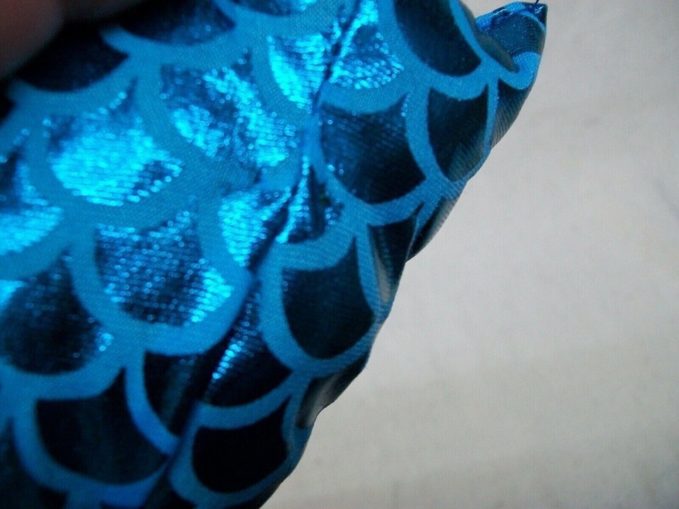 Mermaid Costume Tail. Stuffed mermaid fin with metal clip on to belt or waist of pants. Can be worn by guys or gals. There's a short wire inside for some slight shaping if desired. Shiny Fish scale print fabric with stuffing. Approx. 12" long and approx. 7.5" at widest part. Cute accessory for your next aquarium visit or under the sea themed party. One size fits most.