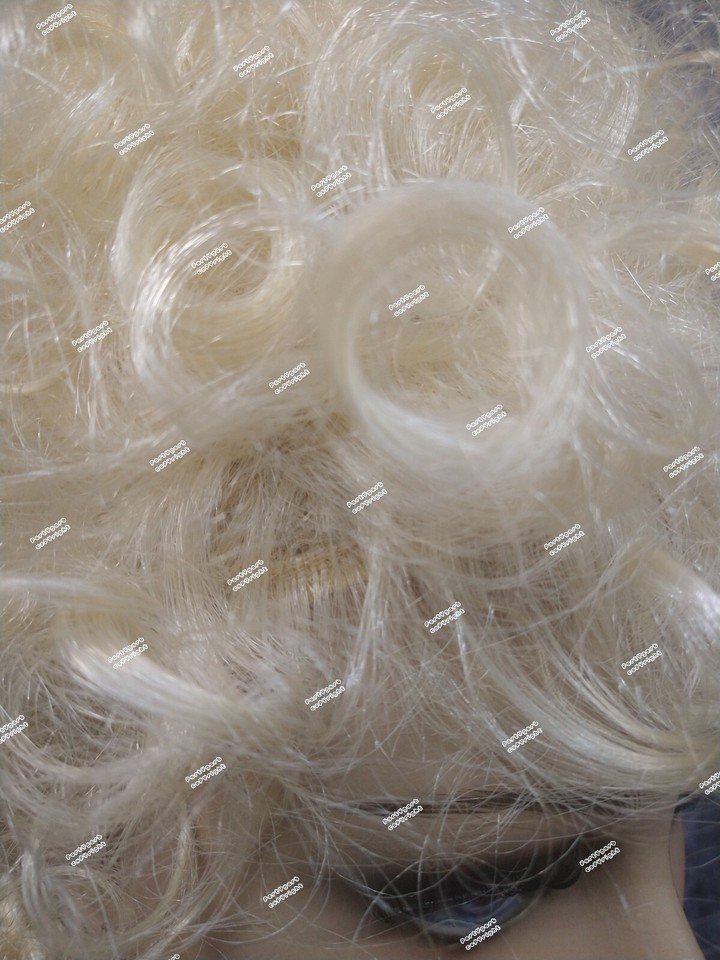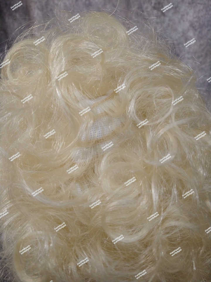 Colonial Belle Costume Wig. Frizzy Top Curls. Ponytail is more toward the side. Exact Position will vary depending on how wig is worn. There's some shorter hair on one side. I think this is filler hair and can be pinned up. The bangs could be worn smoothed to the side or curly. High cone stiff net on top may require some light stuffing to maintain shape. Fiber will need to be adjusted especially on top to conceal the net on the cap. Will require additional styling. Expect Shedding.