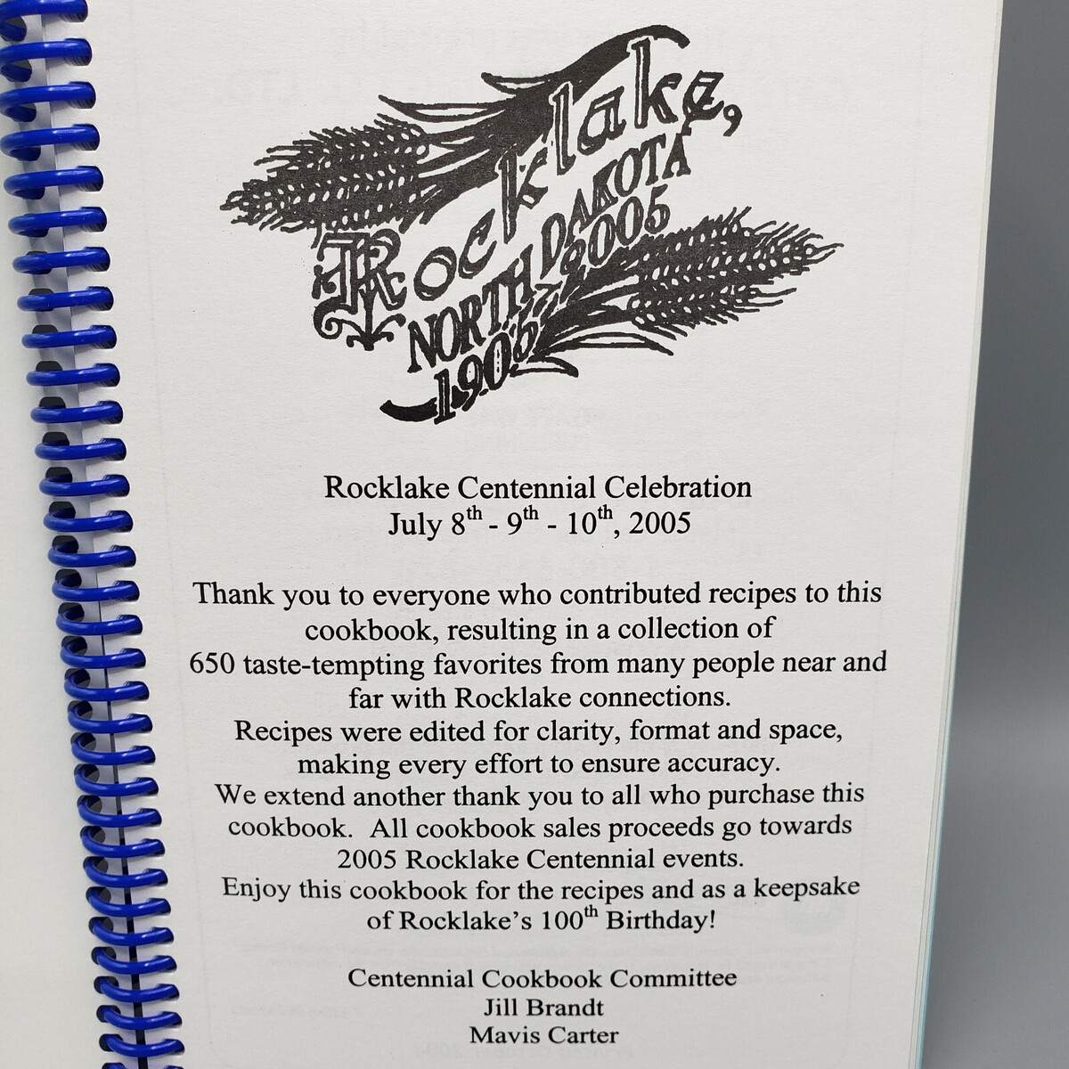 Vintage Rocklake Centennial Cookbook 1905-2005 compiled by the Centennial Cookbook Committee. This community cookbook includes 600+ recipes from people with connections to Rocklake, North Dakota. It is a spiral-bound softcover that was published by Gateway Publishing in 2004. It measures approximately 8-7/8" tall, 6-1/4" wide, 3/4" thick.