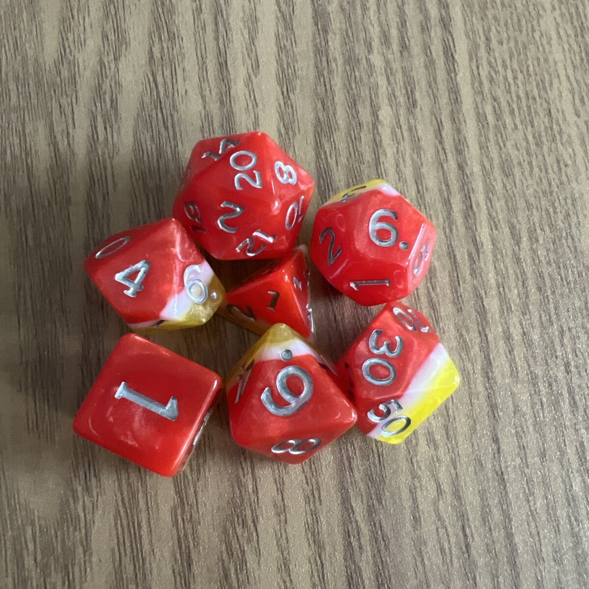 The product is a 7 piece dice set designed for use with Dungeons Dragons. The dice feature a yellow, orange, and white color scheme, adding a fun and vibrant touch to gameplay. This set is perfect for players who want to add a colorful and unique element to their gaming experience while still being true to the classic Dungeons Dragons aesthetic.