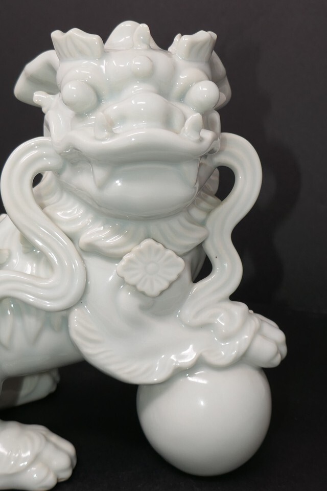 Elevate your space with the elegance of Japanese craftsmanship in these large detailed Foo Dogs figurines. Designed for discerning collectors and styled to complement any room, this set includes a pair of these majestic creatures, each standing 7 inches in height, with a length of 8 inches and a width of 4 inches. Their light blue green tone adds a serene touch to their surroundings, making them an ideal addition to your home or office.