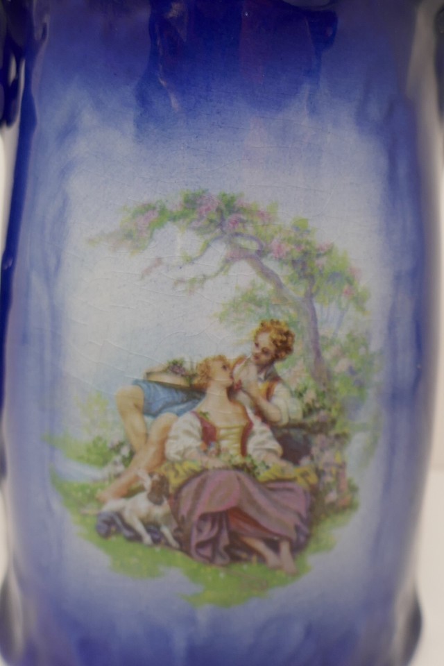 Up for sale is a vintage KH Pottery Staffordshire England Royal Blue Water Pitcher. This measures approx. 6" tall and 5.5" wide with the spout and handle. Has no chips but does have crazing.