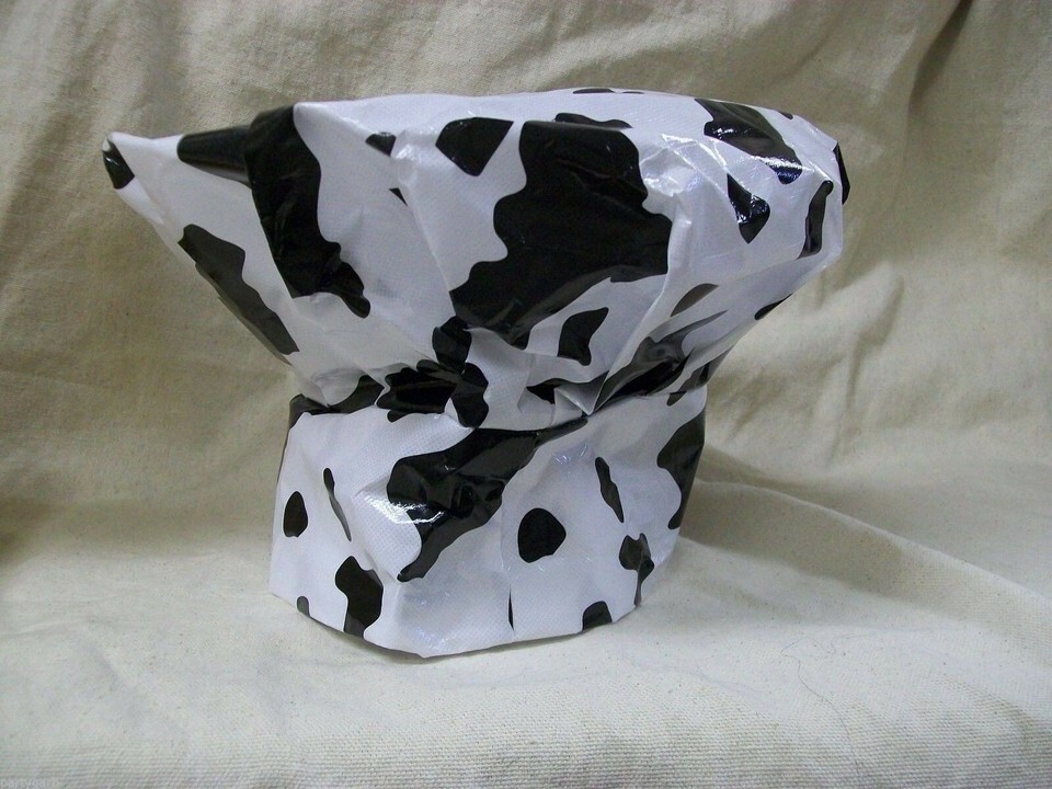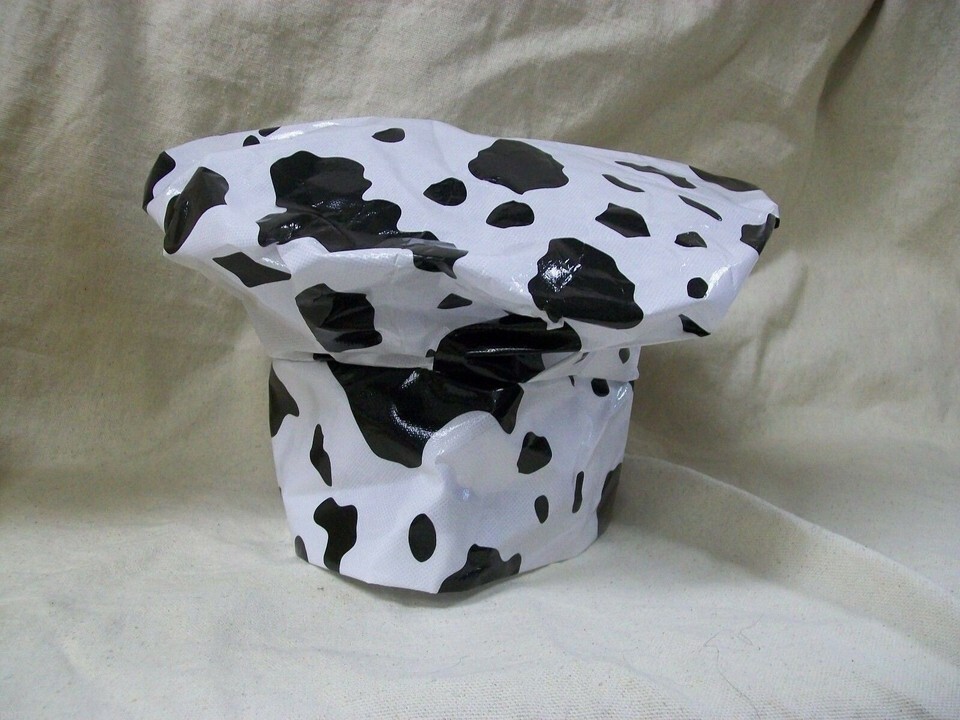 Cow Print chef costume Hat. Adult: One Size fits most. Does Not Adjust. Unisex: Male or Female. Made of a Lightweight Plastic like Material (Similar to Tyvek). Pleated or puckered where it meets the band. The top part of the hat is floppy easily put in like a mushroom shape. Hat can also be stuffed with a lightweight material to achieve desired poufy shape.