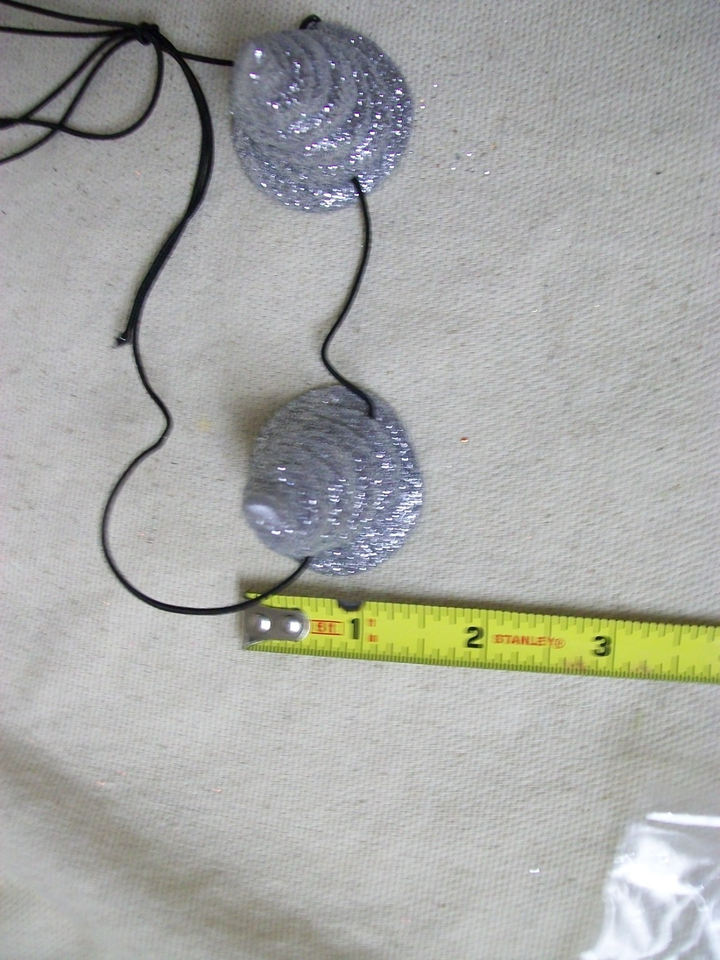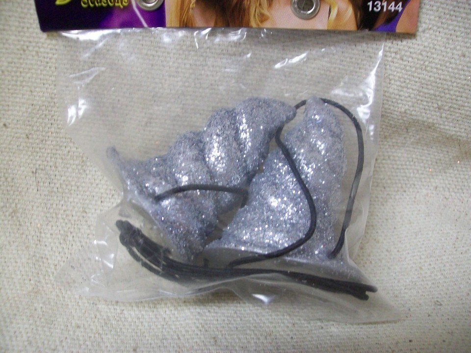 Miniature Spiral Costume Horns. Silver Gliitery Horns. Glitter does sheds. Light Weight. Has an elastic string that can be tied up to adjust for different size noggins. For ages 8 and up. Unisex. DOES NOT INCLUDE MANNEQUIN HEAD. Approx. measurements in the photos.