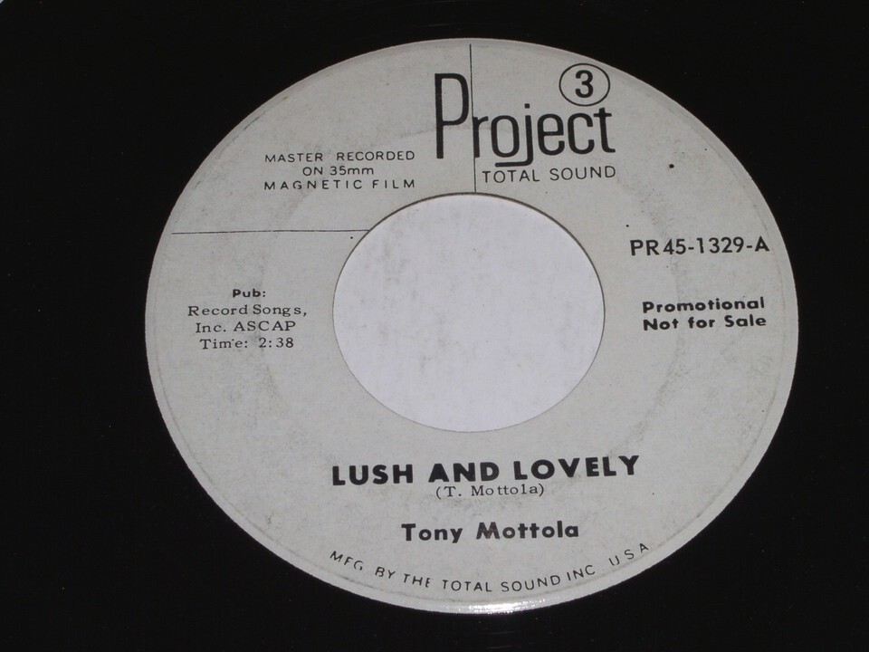 This is a vintage, promotional 45 rpm phonograph record by Tony Mottola entitled, "Lush And Lovely". Flipside: "Somethin' Stupid". Record Label: : Project PR 45-1329.