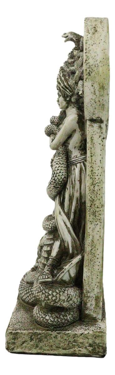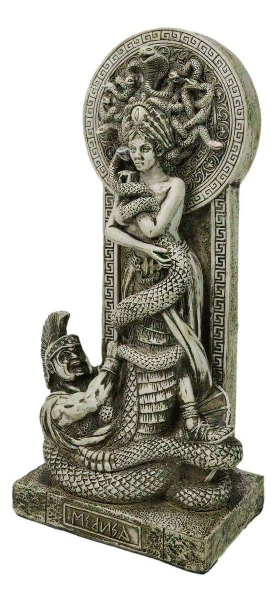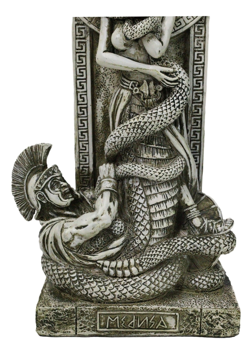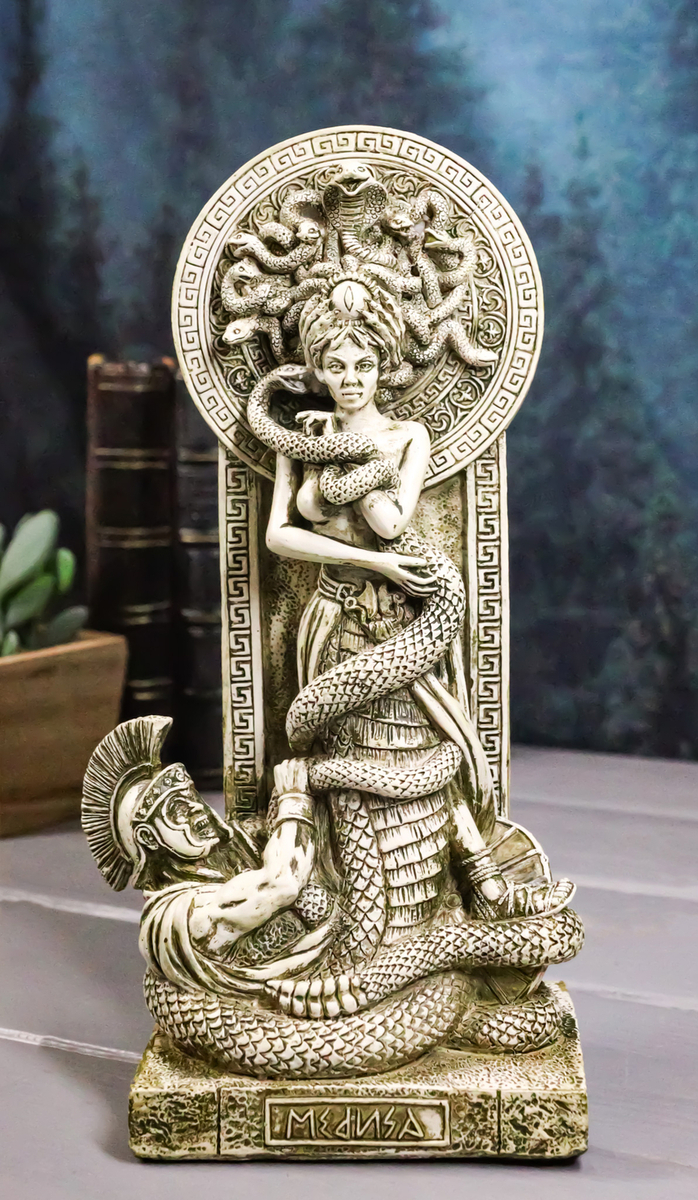 ? Unleash the power of ancient mythology with this stunning Medusa Figurine, featuring the fearsome Gorgon standing on an altar throne. With her iconic hair made of snakes and a giant serpentine tail coiling beneath her, Medusa exudes an aura of danger and mysticism. The dramatic scene is further intensified by a Greek warrior, fallen at her feet, capturing the essence of Medusa's mythic wrath. This intricately detailed statue is a perfect addition for collectors of Greek mythology.