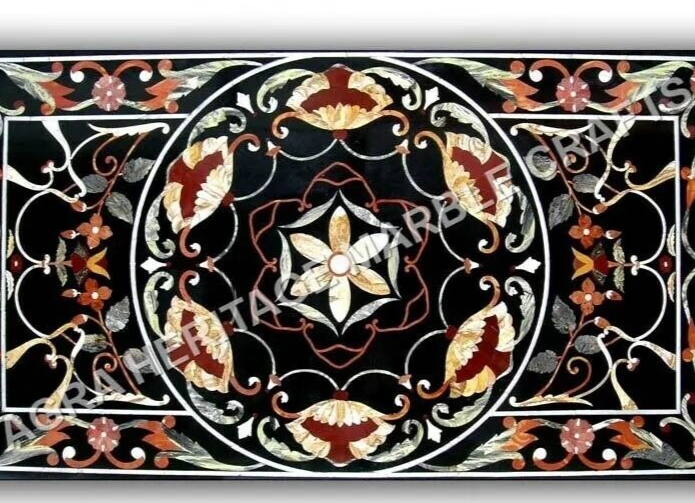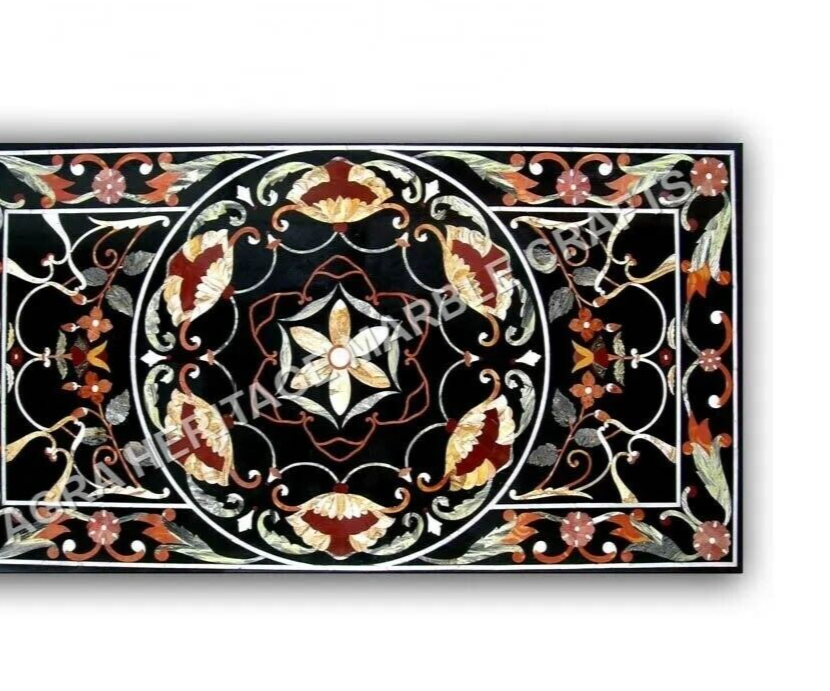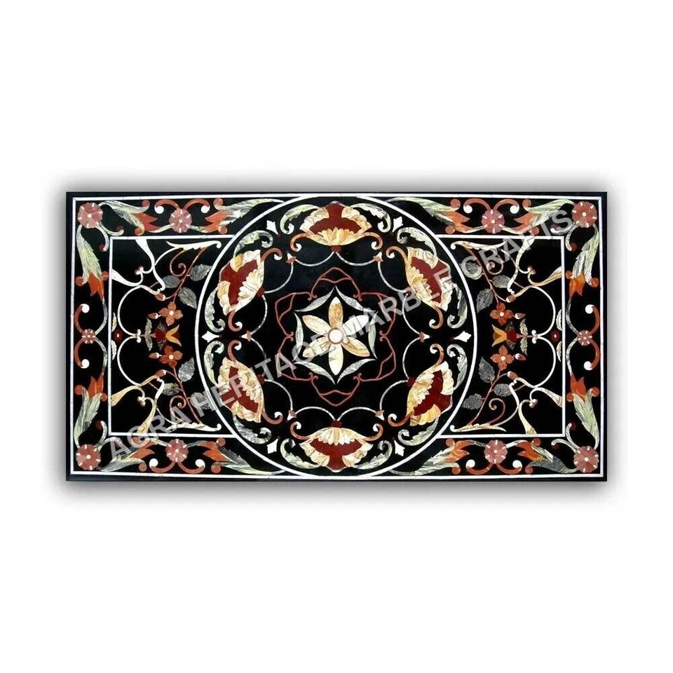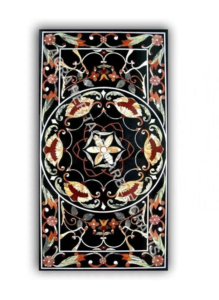 6'x3' Black Marble Center Dining Table Gemstone Inlay Marquetry Arts Hallway Dec