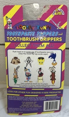 The 1995 Looney Tunes Toothpaste Toppers Toothbrush Gripper features characters Wile E. Coyote and the Road Runner from the classic animated series. This collectible item allows fans to attach the toothbrush gripper to their toothbrush, adding a fun and nostalgic touch to their oral hygiene routine. Perfect for any animation merchandise collector or Looney Tunes enthusiast, this item brings a piece of the beloved franchise to life in a unique and practical way.
