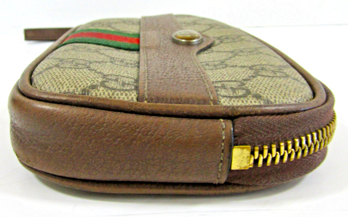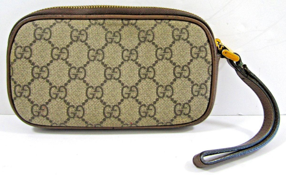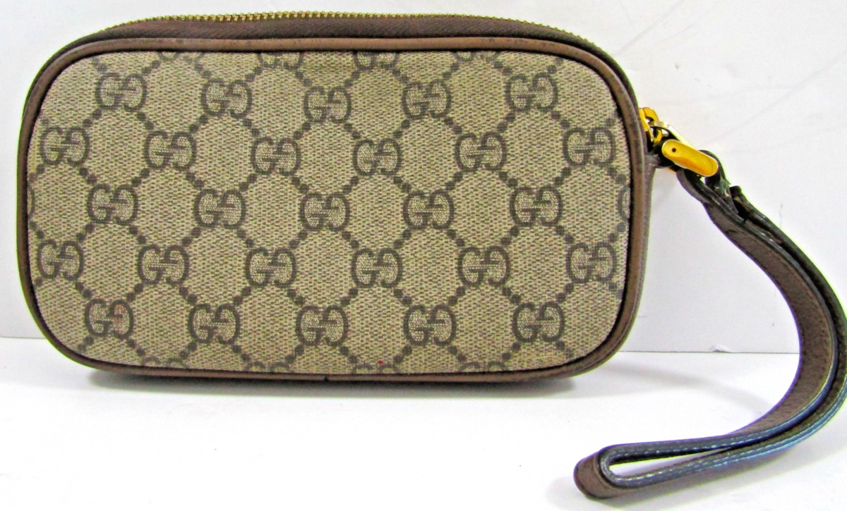 The Authentic GUCCI Ophida GG Supreme Wristlet is a stylish and luxurious accessory for women. This rectangular wristlet features the iconic Gucci GG pattern in beige canvas with gold hardware accents. The bag has a zip closure and a suede lining in beige, adding a touch of luxury to the design. The wrist strap handle is brown leather, making it a versatile and chic addition to any outfit. The vintage Gucci GG Ophida model exudes designer charm and sophistication, making it a must-have item for fashion-forward individuals.