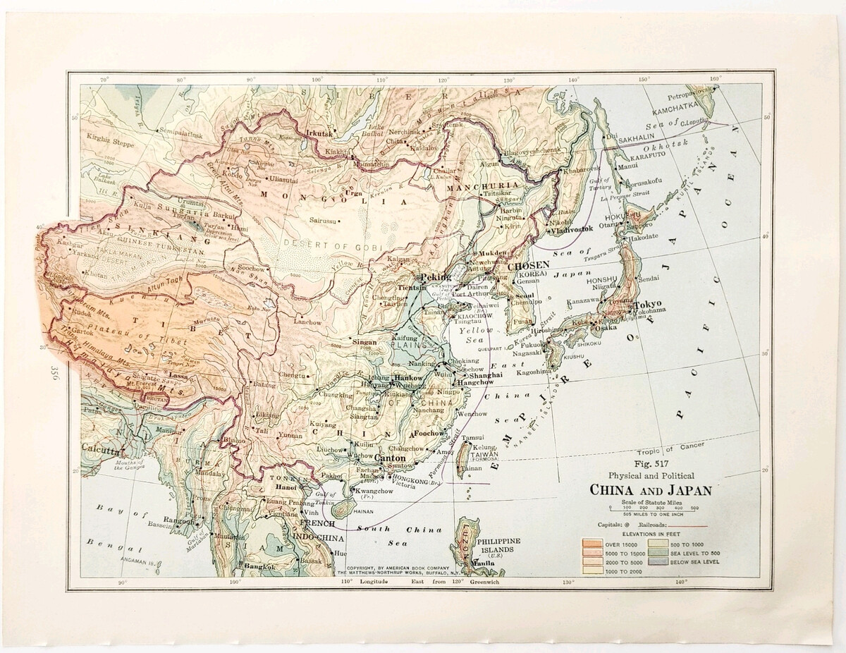 1916 Map China Japan Mongolia Korea Asia Physical Political Boundaries DWSS9