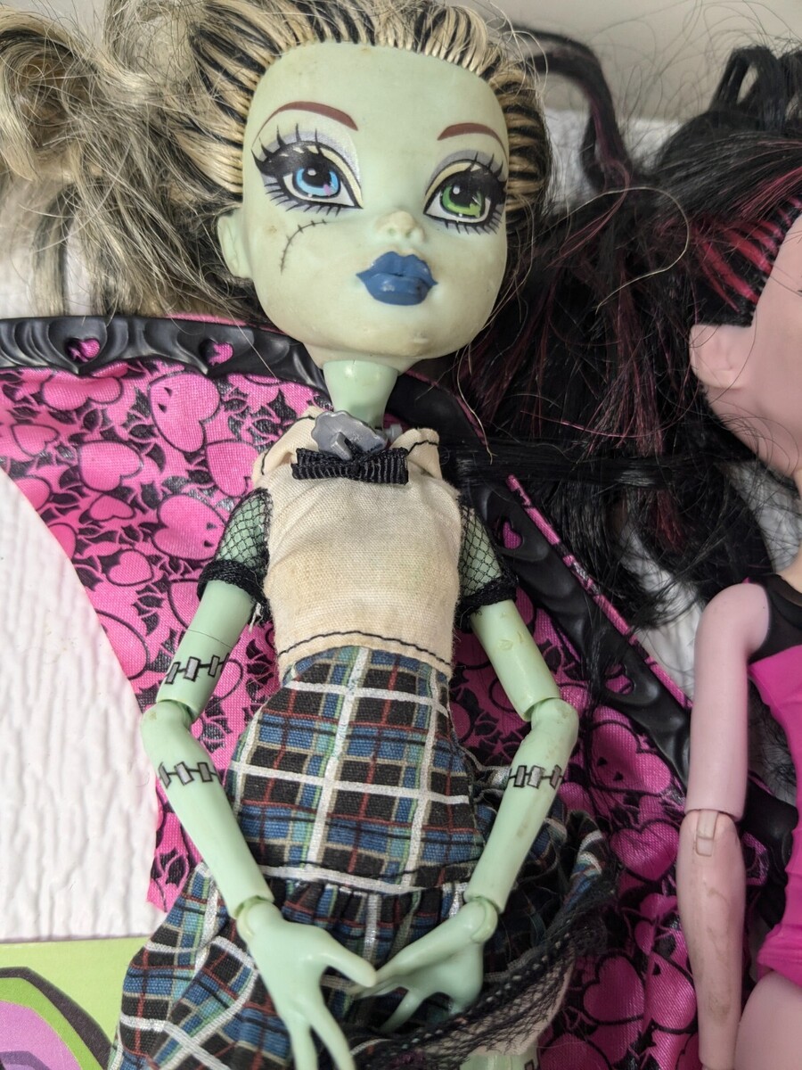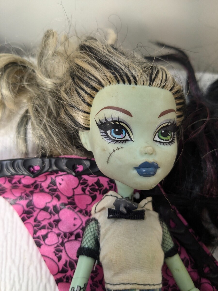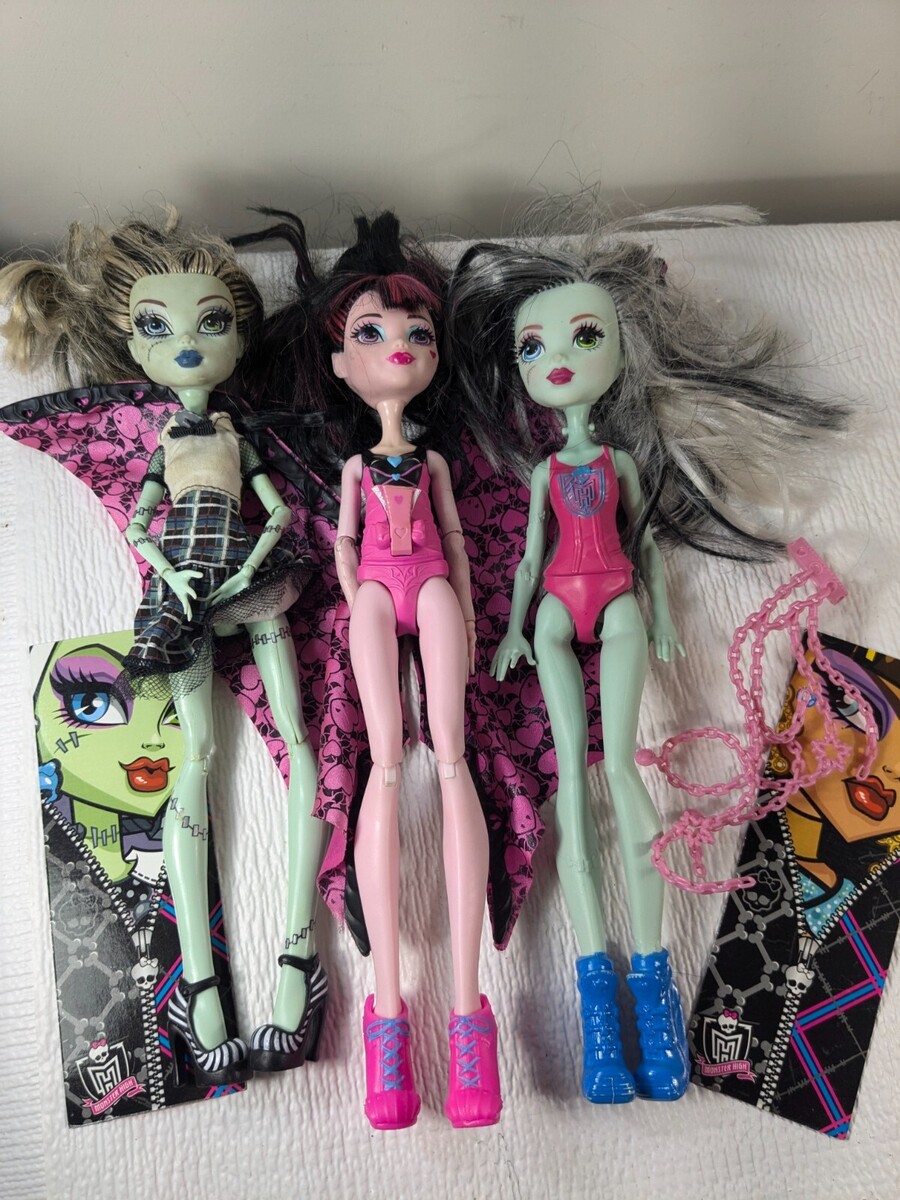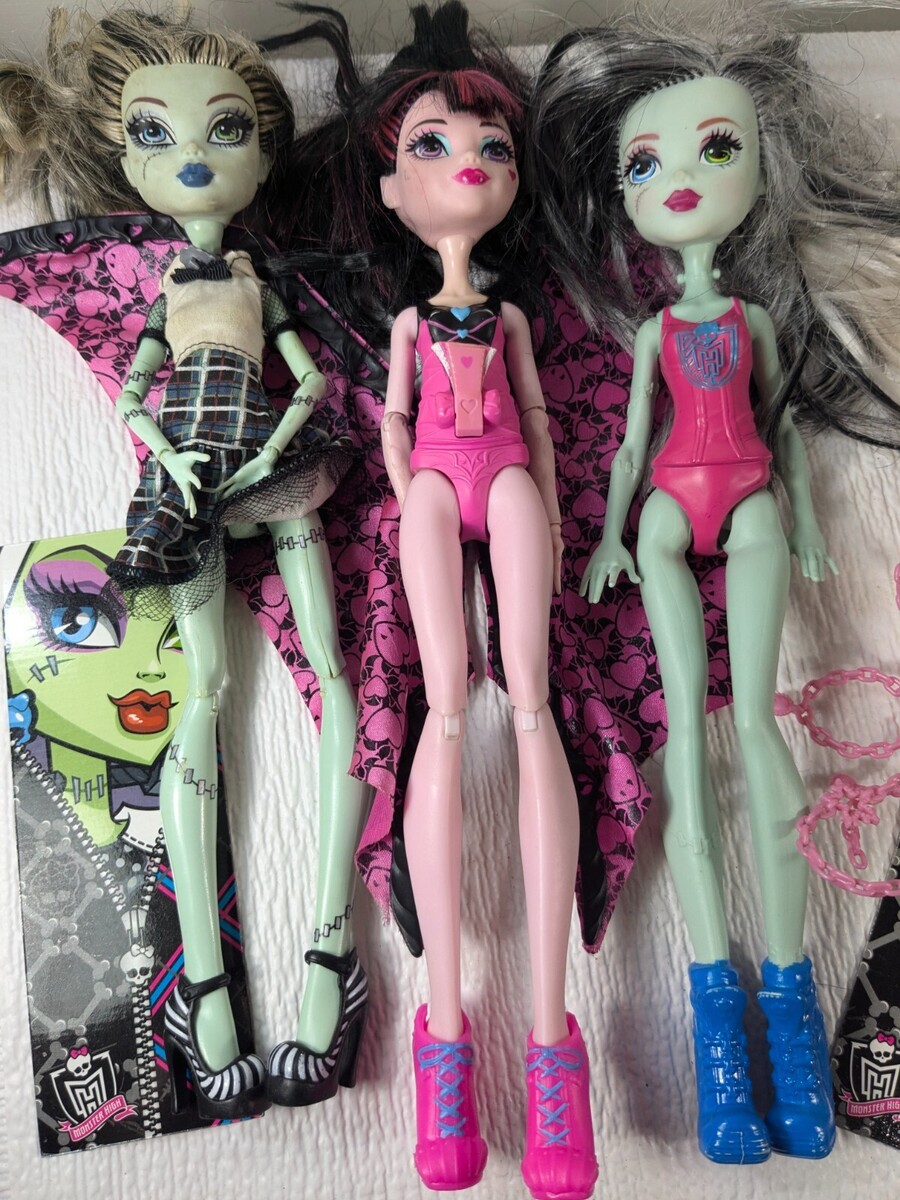 Frankie Stein S1 Cheerleader, Frankie Stein, Ghoul To Bat Draculaura, 2 ruler bookmarks, Kiyomi Haunterly Belt. All need TLC/cleaning/repair. See pics as shown.