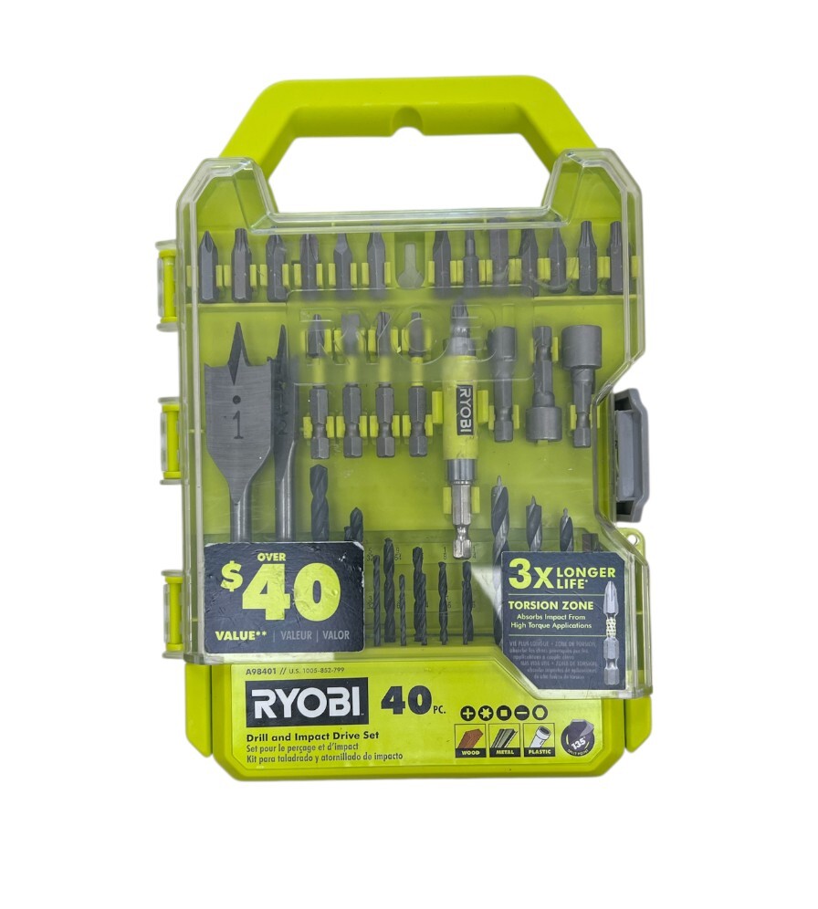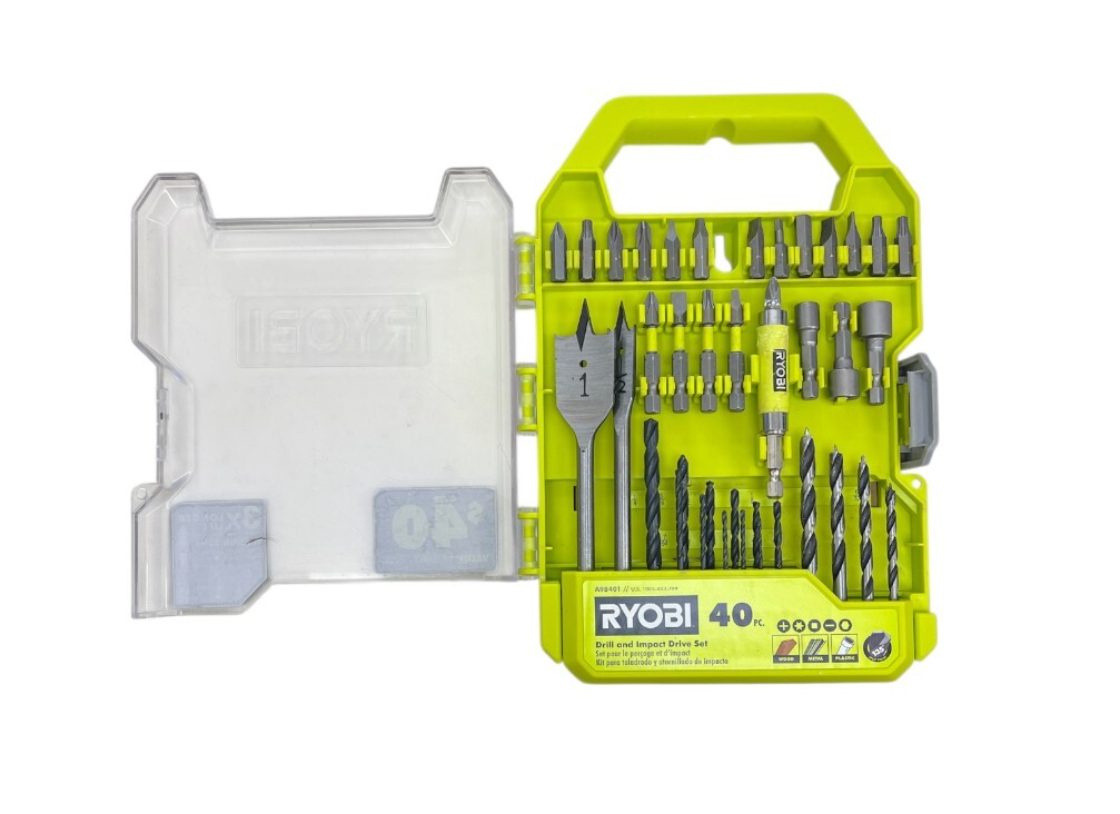 Category: Cordless hand toolsType: Drill bitsBrand: RyobiModel number: A98401Size: 40PCsColor: GreenPower source: Hand-heldBattery Included: noCase included: yesCharger Included: noNumber of pieces: 40Condition:UsedNotes:A98401 Drill and Impact Drive Kit (40-Piece)
