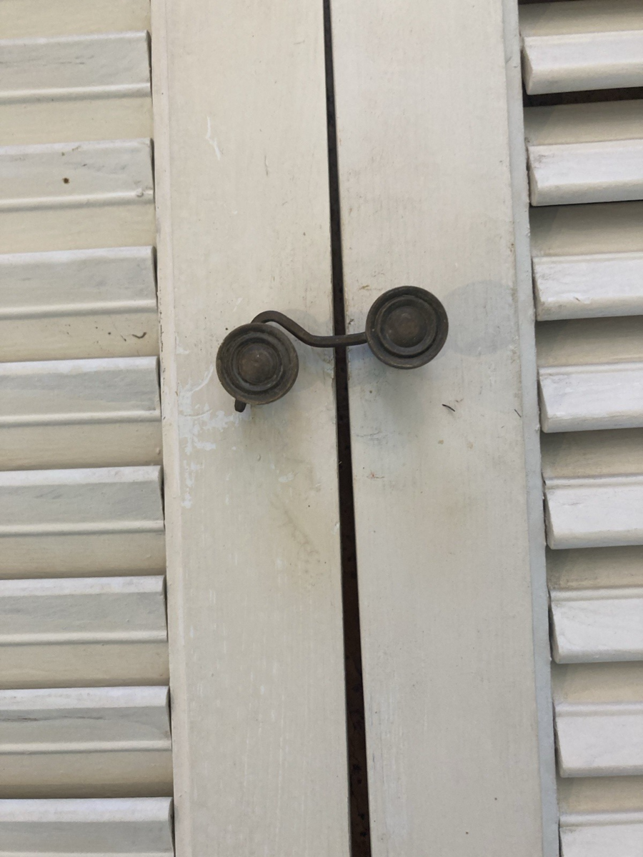 Set of 4 vintage wood shutter for 1 window. 2 are small, 2 are larger. The small can be used above the large for letting light in above with privacy below. Or, the small can be used below as a cafe shutter.
