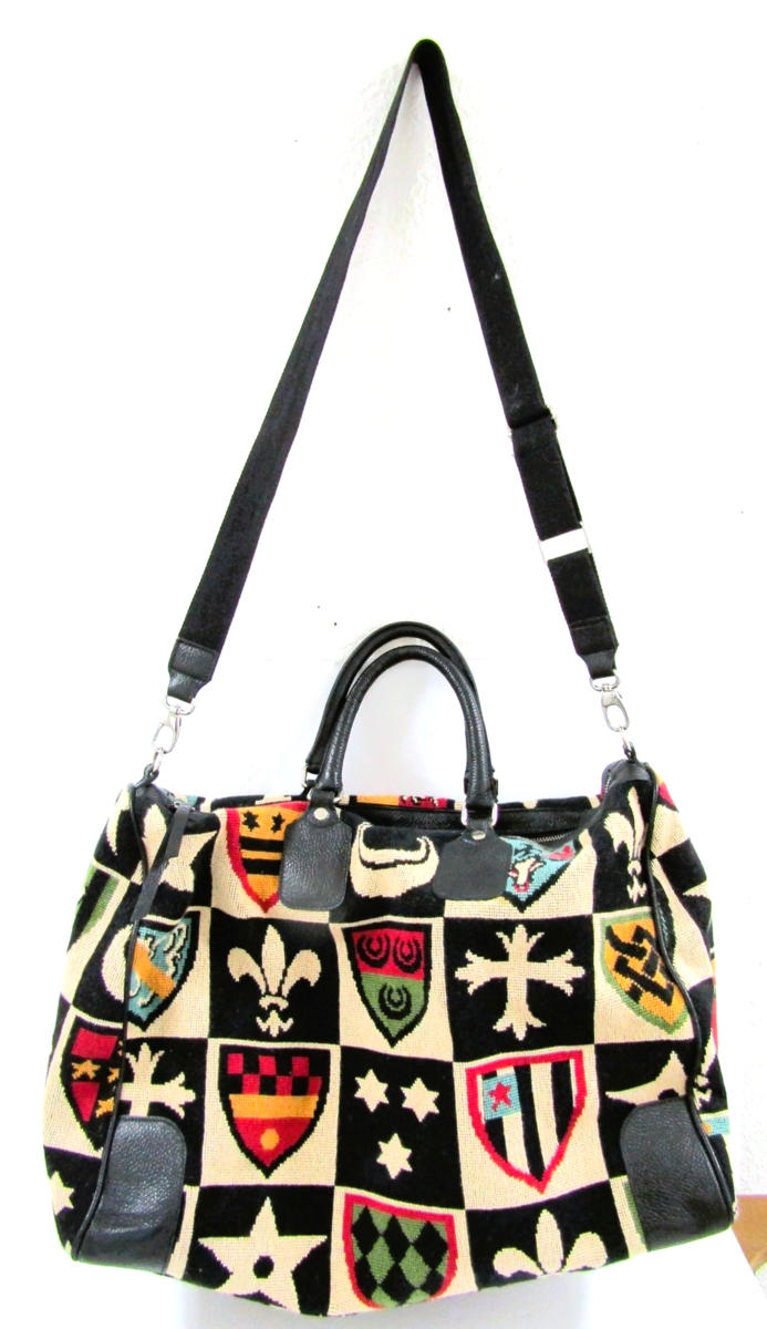 The Stubbs Wootton Crest Black Needlepoint Weekender Bag is a stylish and versatile top handle bag suitable for both men and women. Made from a cotton blend material with a cotton lining, it features a multicolor design that adds a touch of sophistication to any outfit. This bag comes with practical features such as mobile phone and audio pockets, inner pockets for organization, bottom studs for protection, and an adjustable and detachable strap for convenience. Perfect for carrying all your essentials in style, this weekender bag is a must-have accessory for any fashion-forward individual.