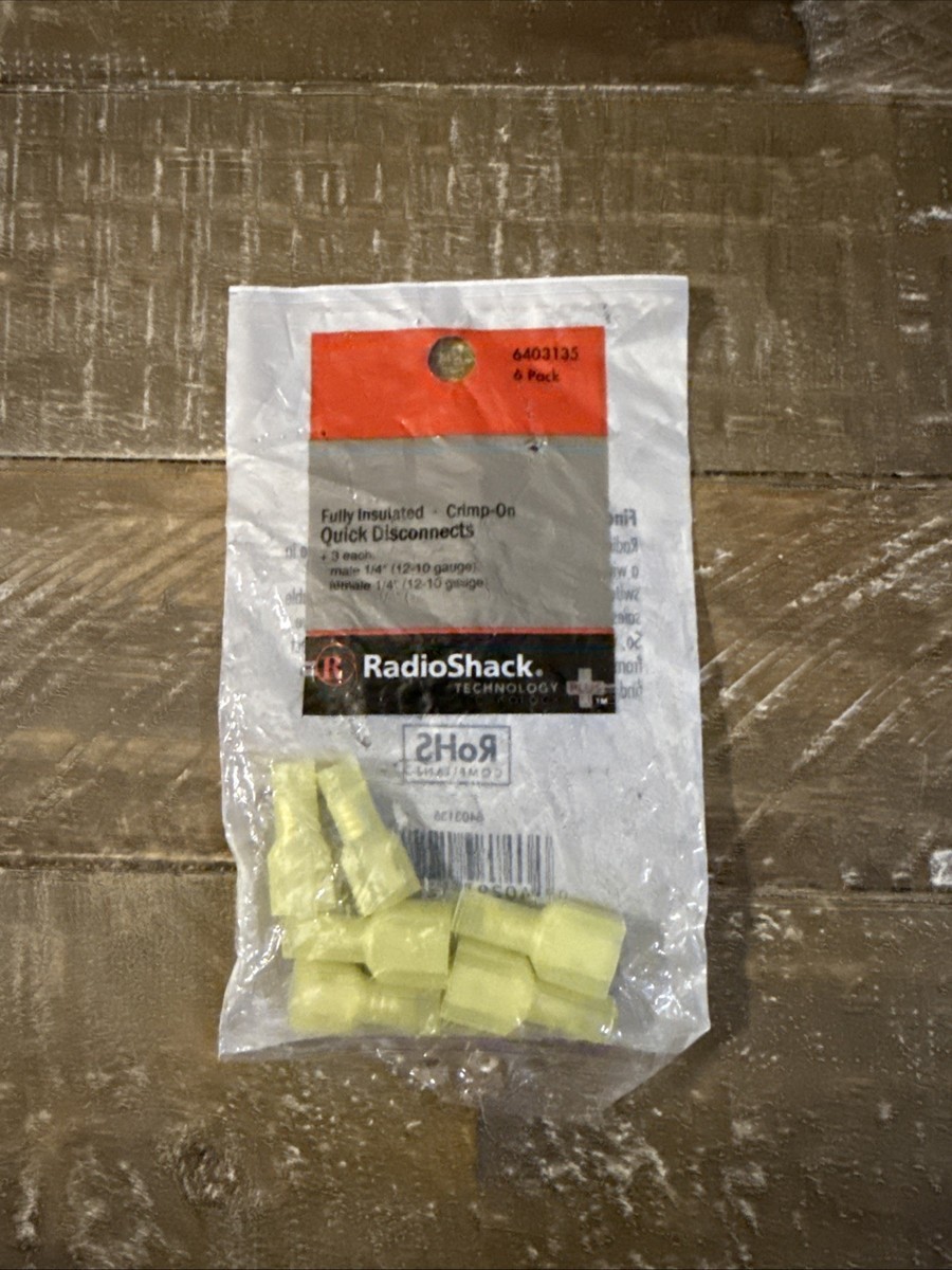 The RadioShack 640-3135 Insulated Crimp-On Quick Disconnects are a set of 6 male and female connectors designed for secure wire connections. These yellow connectors are compatible with wire gauges ranging from 31-35 AWG and are crimp-on style for easy installation. Ideal for electrical equipment and supplies, these connectors are perfect for use in various wire and cable connections in both male and female configurations.