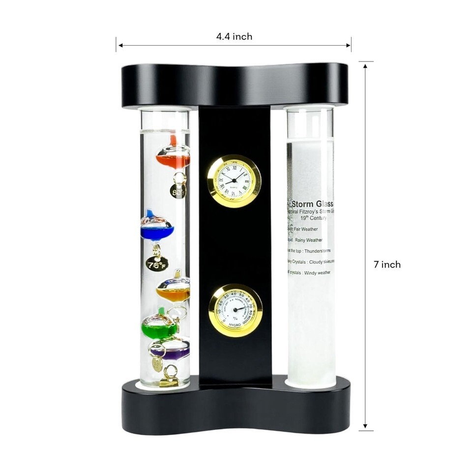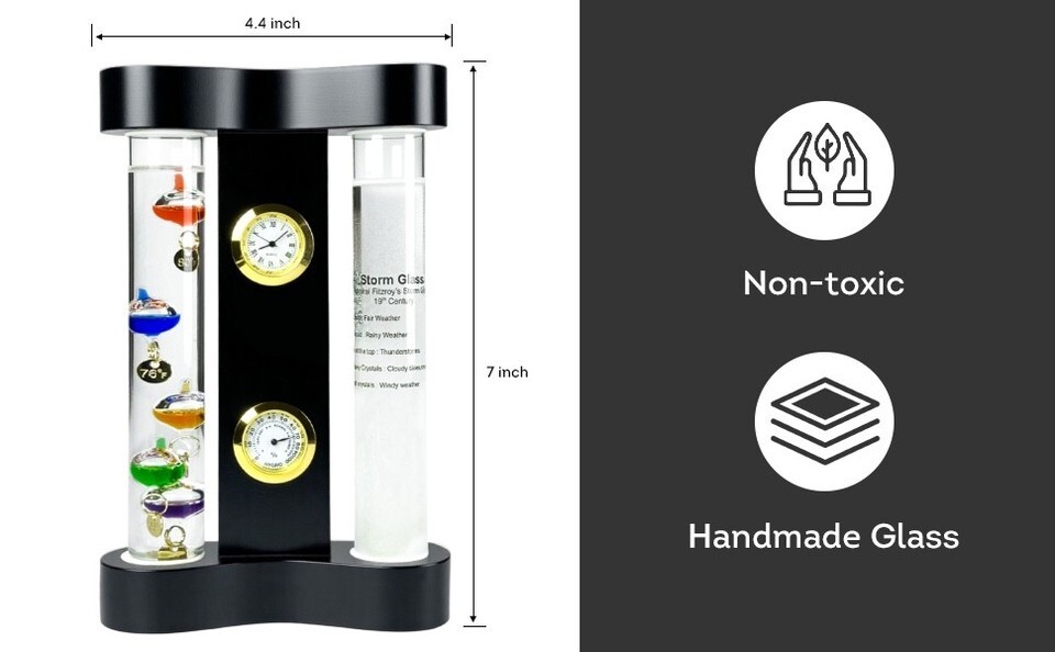 The Around The Clock Shop FitzRoy's Storm Glass works to predict weather patterns 1-2 days in advance, helping you manage your days so you can plan ahead. It provides a weather indication without depending on any external methods. It can predict changing weather conditions such as sunny, cloudy, fog, storms, snow, and more!
